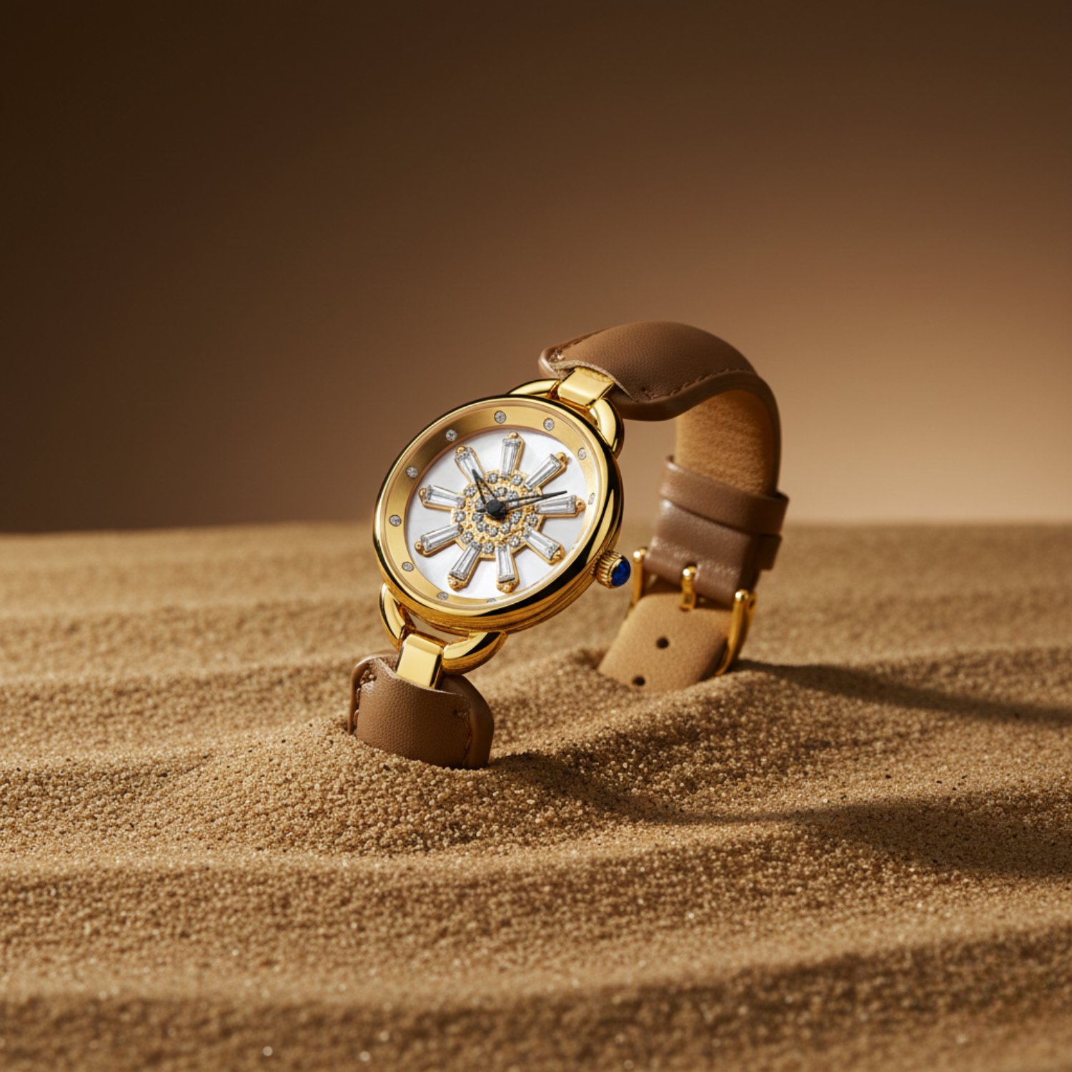 • Round Stainless Steel Case: Strong, corrosion-resistant construction with a polished gold finish.