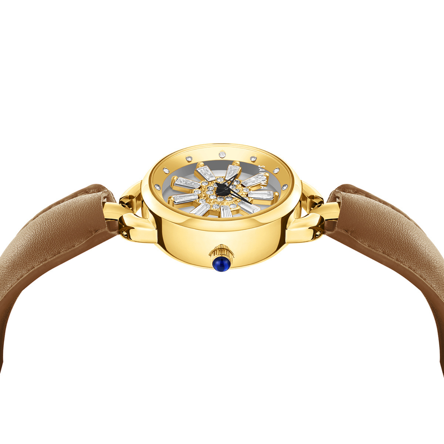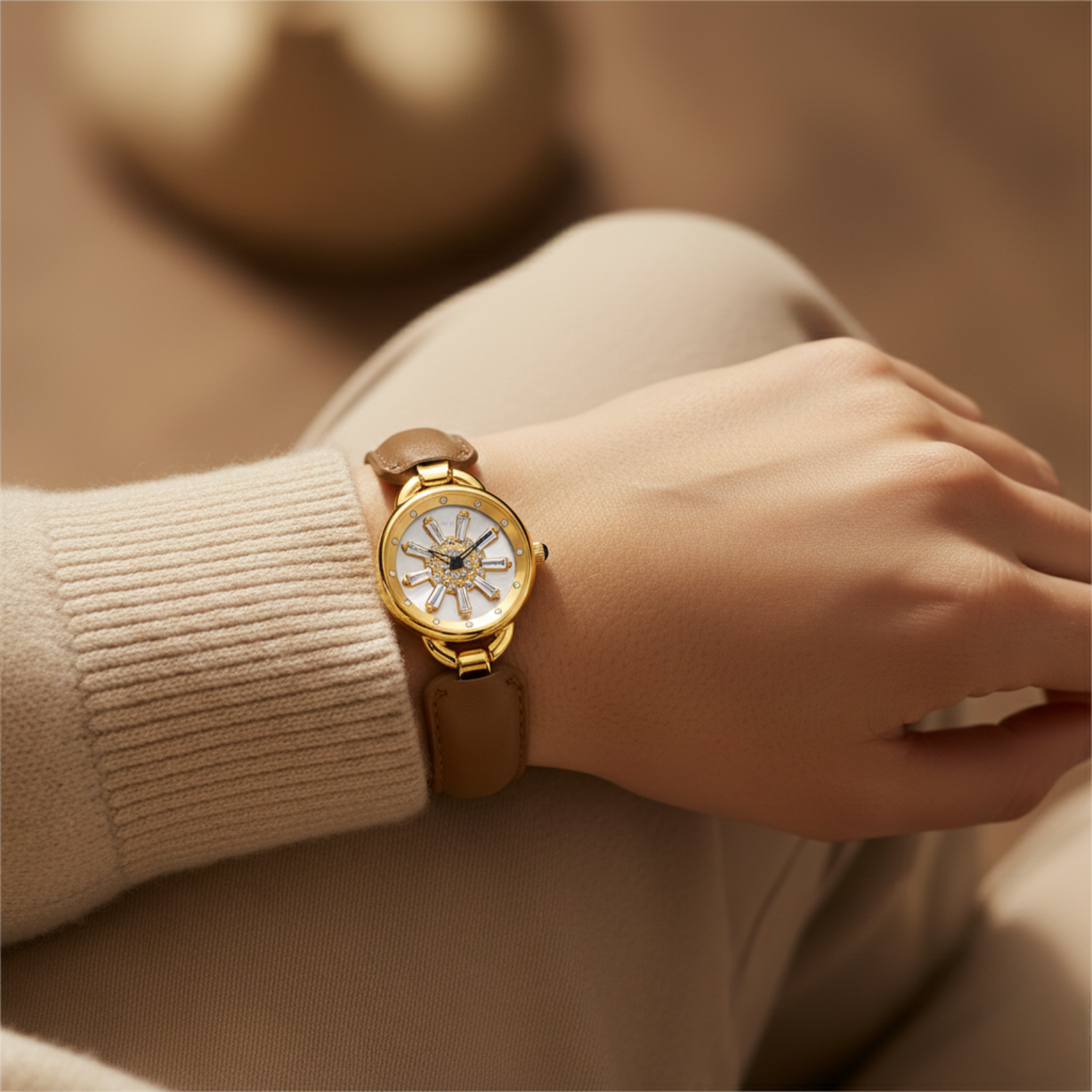Crafted with a polished stainless steel case in a radiant gold finish and paired with a refined leather strap, the Aurora Watch blends modern innovation with classic femininity. Powered by a precise Japanese quartz movement, it offers reliable performance wrapped in a sophisticated design.