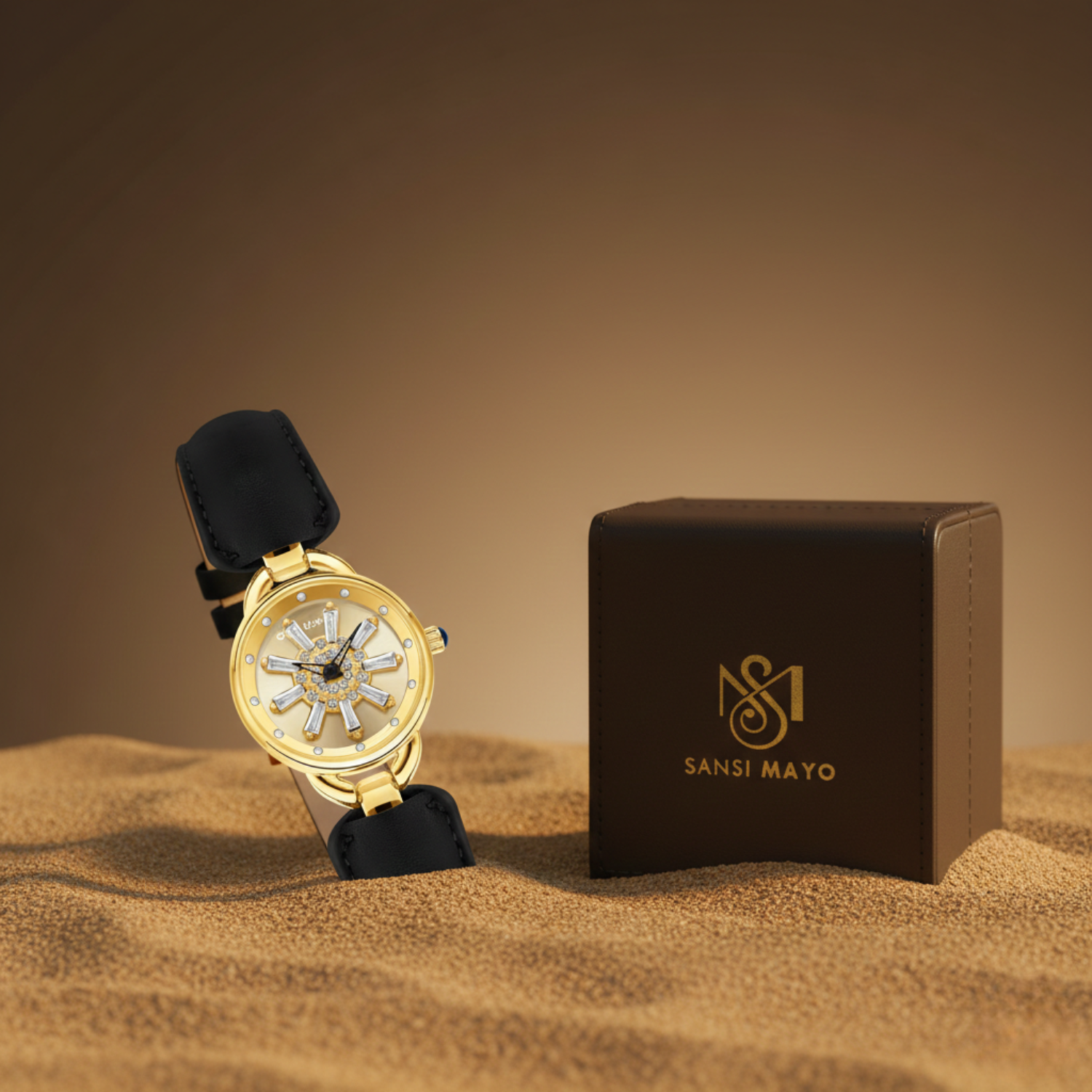 The Sansi Mayo Aurora Black Gold Edition is crafted for women who appreciate refined luxury with a modern twist. This elegant timepiece features a dynamic rotating inner dial that gently moves with wrist motion, creating a captivating sense of depth and interaction.