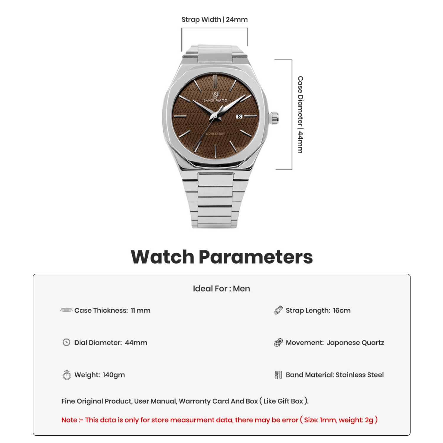 Discover a blend of elegance and functionality with the Sansi Mayo Men’s Silver & Brown Stainless Steel Two-Tone Wrist Watch. Featuring a rich brown dial, this watch is designed to stand out. The quartz movement ensures precise timekeeping, while the sturdy stainless steel band provides comfort for everyday use. With water resistance up to 50 meters and a 12-month warranty, this timepiece is perfect for both casual and formal settings.
