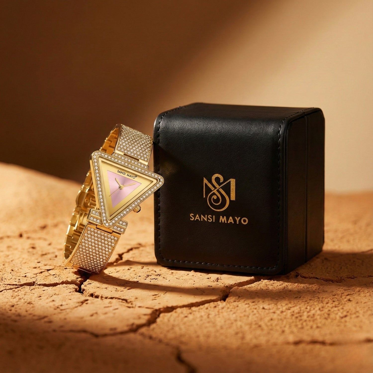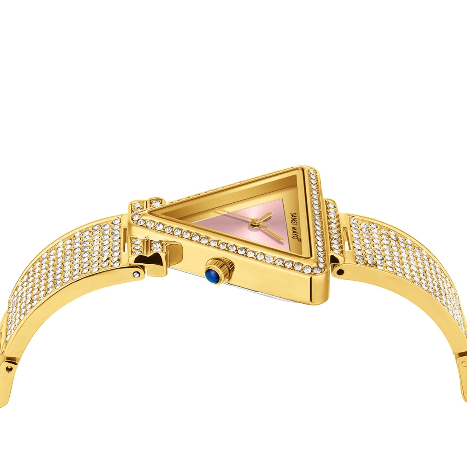 Graceful yet distinctive, the Sansi Mayo Dina Gold & Light Pink Edition is crafted for women who appreciate refined details and modern silhouettes. Featuring a unique triangle-shaped dial paired with a delicate light pink face, this timepiece is enhanced by a studded stainless steel band and luxurious IP gold plating. Powered by a precise Japanese quartz movement, it offers dependable performance with elegant everyday style.