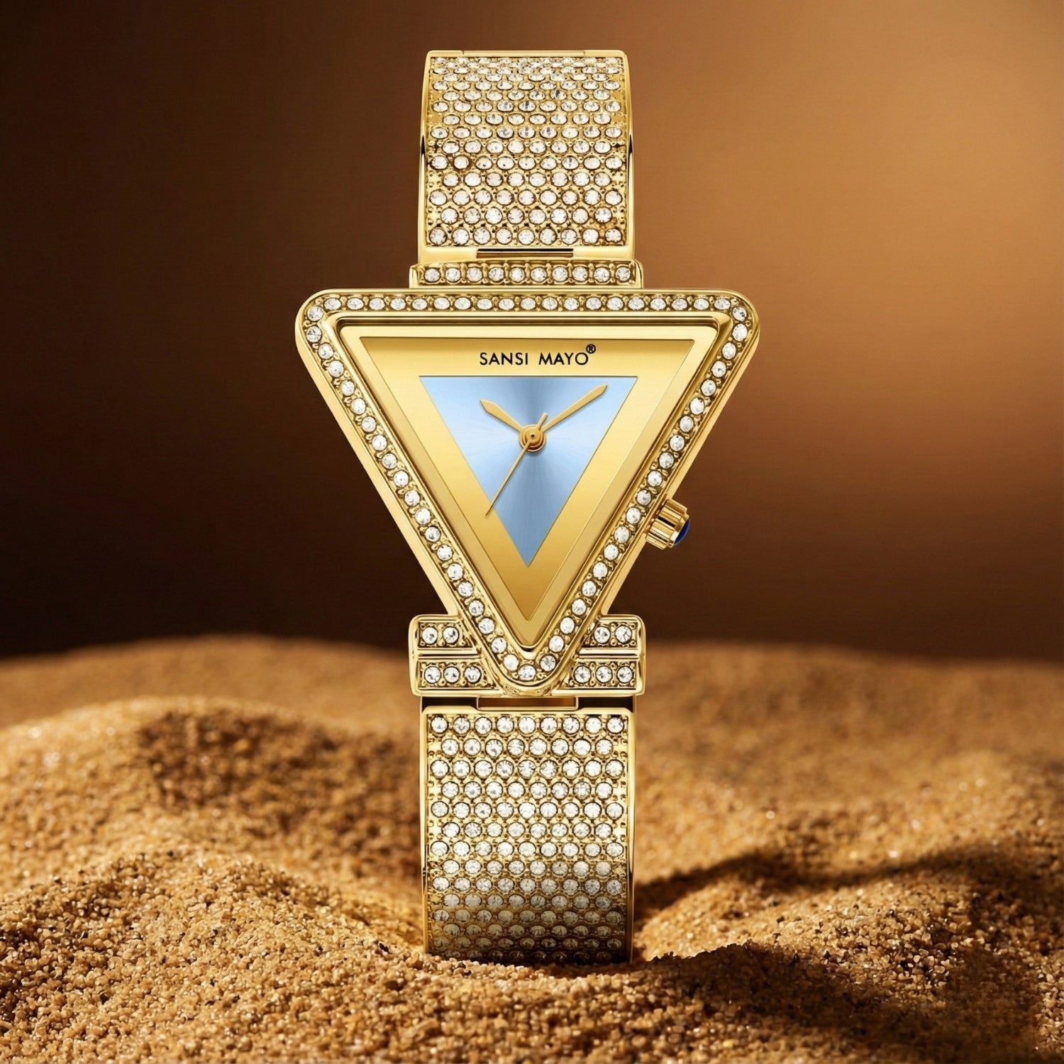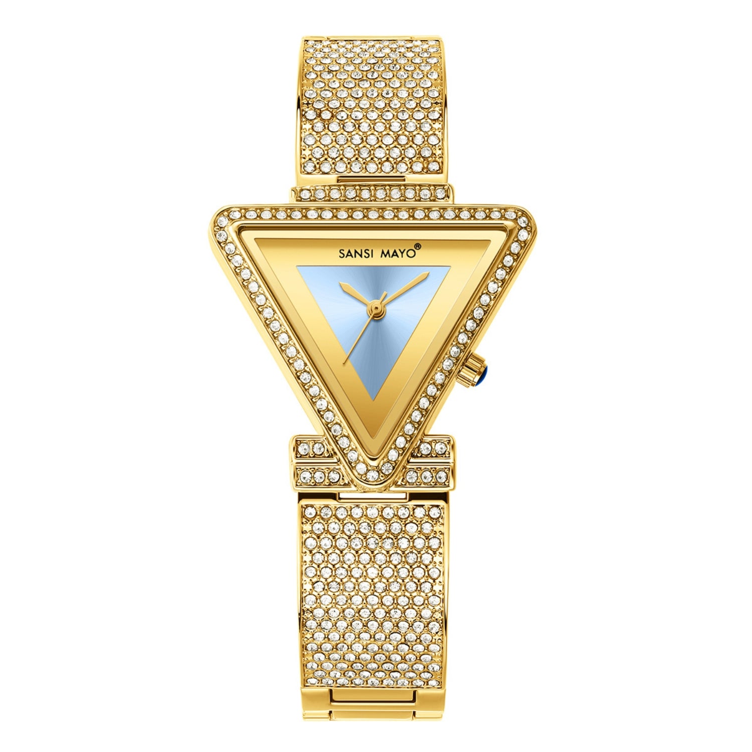 Designed to stand out with elegance, the Sansi Mayo Dina Gold & Sky Blue Edition brings together a refreshing sky blue dial with a bold triangle-shaped case. Accented by a jewellery-inspired studded stainless steel band and finished in luxurious IP gold plating, this women’s timepiece is powered by a precise Japanese quartz movement for reliable everyday performance with fashion-forward appeal.