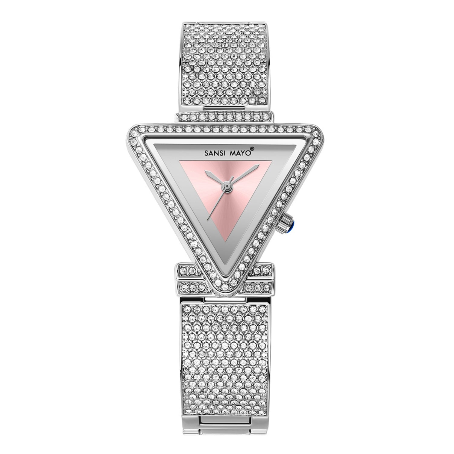 Gracefully designed for women who love subtle color and contemporary design, the Sansi Mayo Dina Light Pink Triangle Edition brings together a delicate pastel dial with a bold geometric silhouette. The triangle- shaped dial paired with a silver studded stainless steel bracelet creates a refined yet fashion-forward statement.
