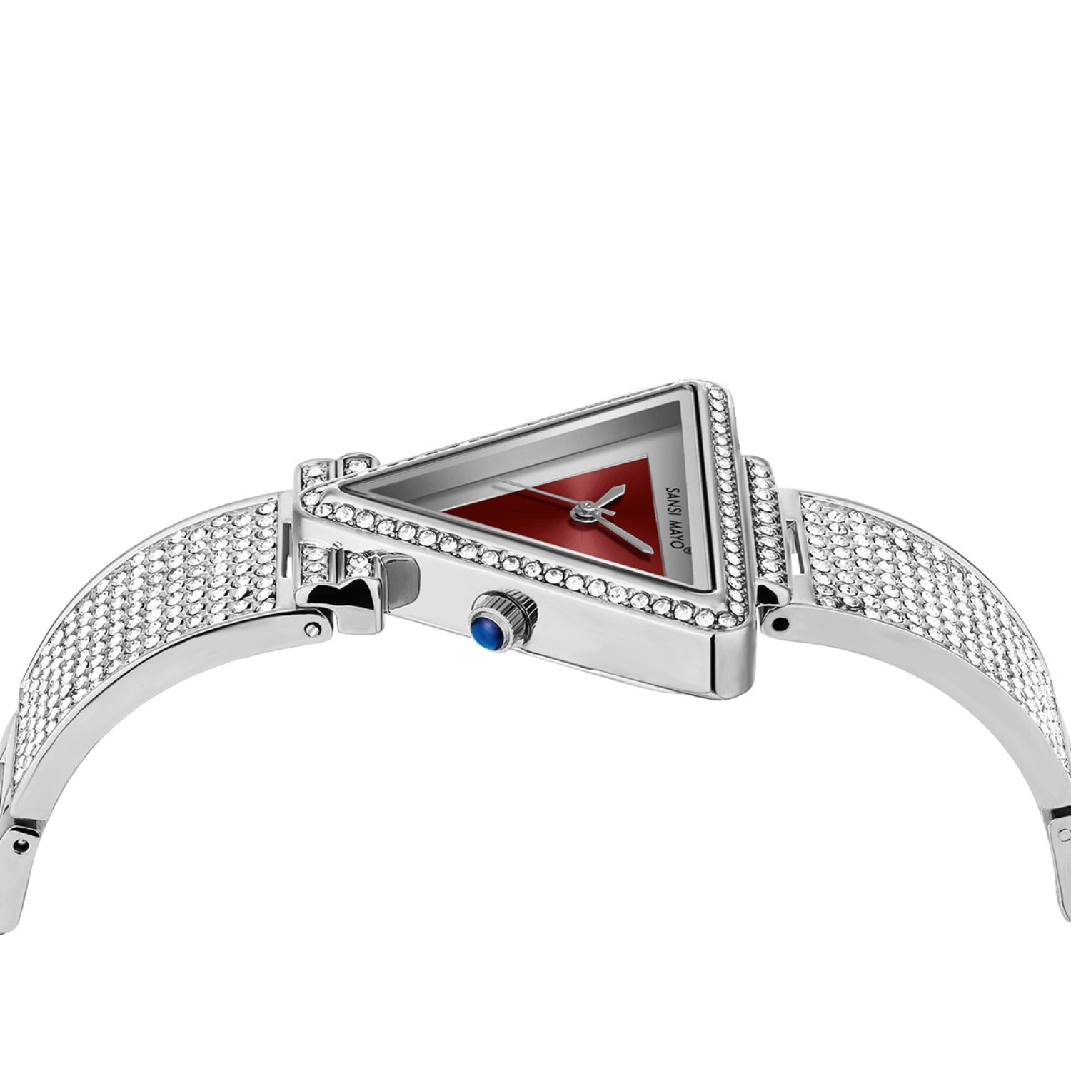 The Sansi Mayo Dina Maroon Triangle Edition is crafted for women who prefer bold elegance with a refined edge. Featuring a deep maroon dial set inside a contemporary triangle-shaped stainless steel case, this timepiece pairs beautifully with a silver studded bracelet for a confident and graceful look.