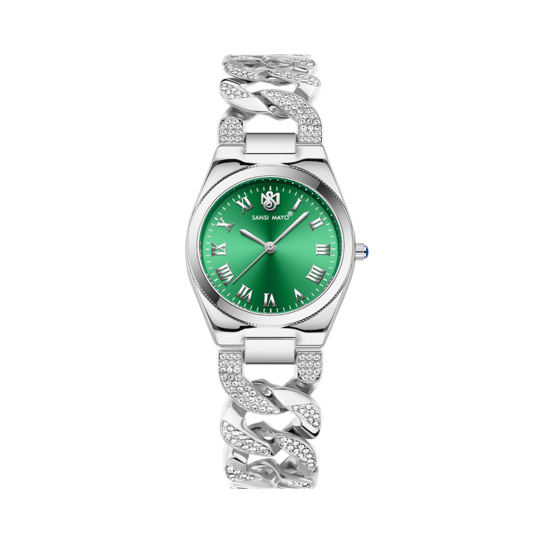 Sansi Mayo ELORA Egyptian Stone Watch — Silver Bracelet with Green Dial