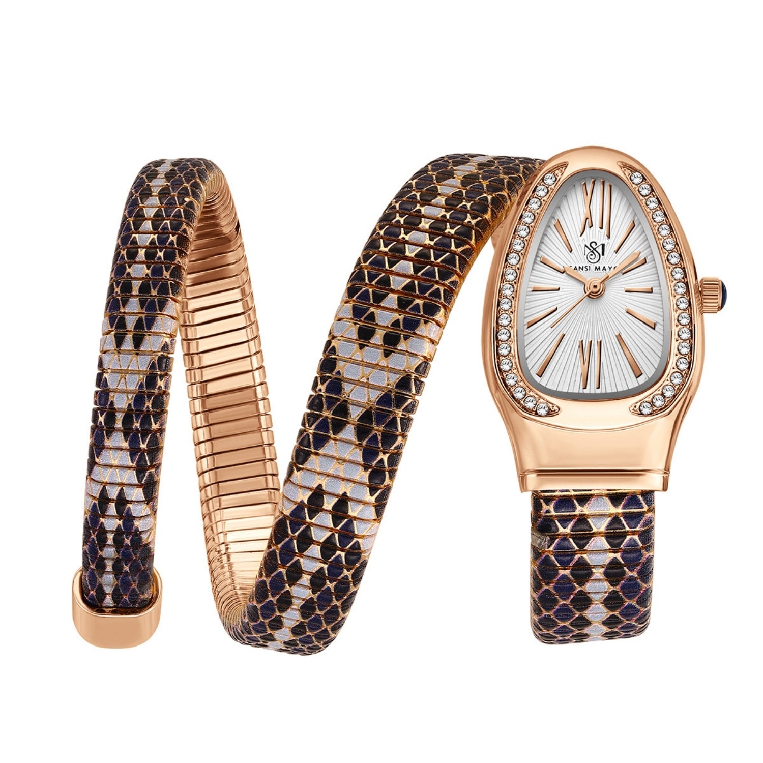Step into confident luxury with the Sansi Mayo Koil Snake Watch — a statement timepiece crafted for women who command attention. Inspired by the fluid motion of a coiled snake, this design wraps the wrist in bold sophistication. The clean white dial contrasts beautifully with the two tone rose gold, black, and silver stainless steel finish, creating a perfect balance of elegance and edge.