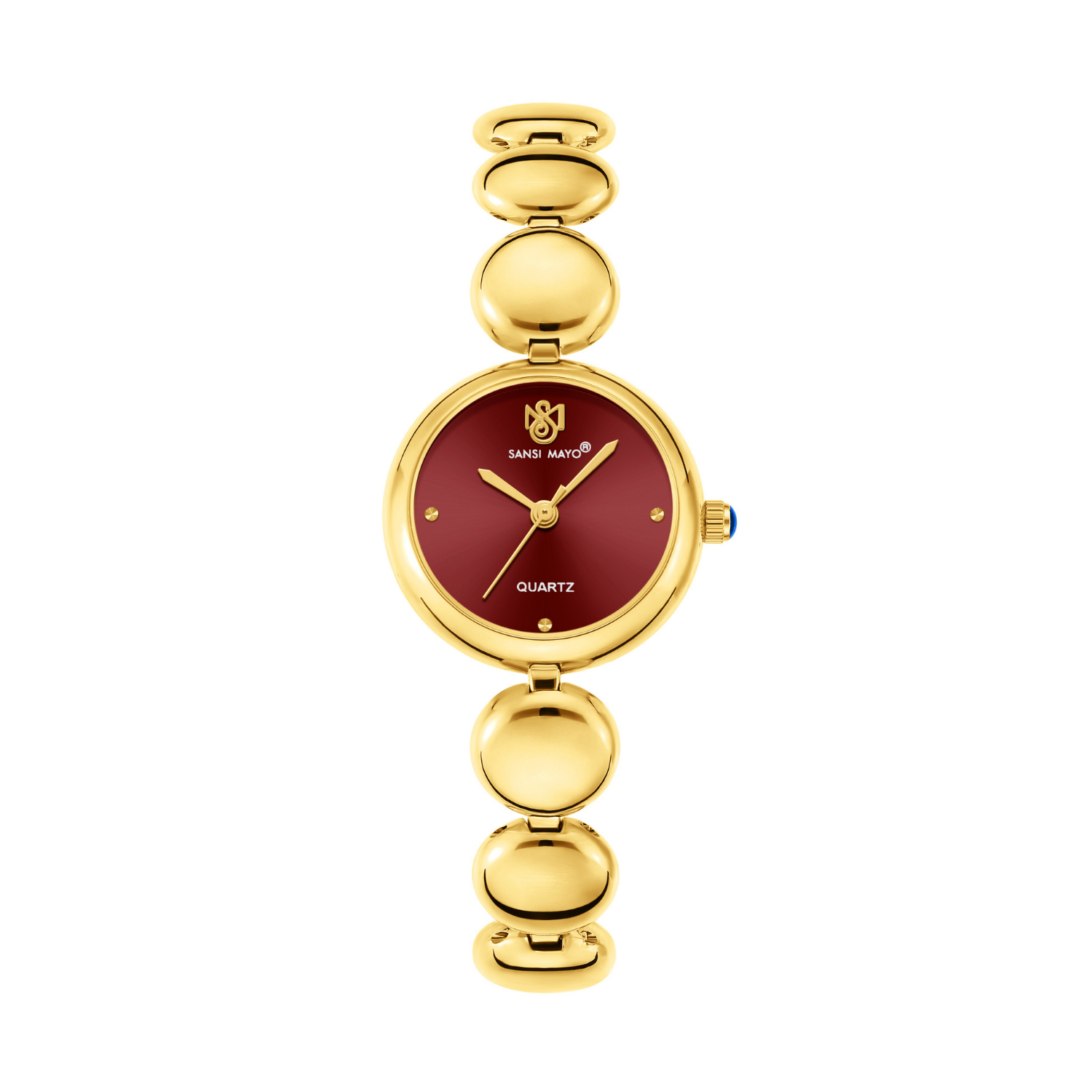Introducing the Sansi Mayo LYANA Women’s Watch — where timeless beauty meets modern craftsmanship. This elegant timepiece features a striking maroon dial paired with a polished gold stainless steel bracelet, making it the perfect accessory for both daily wear and special occasions.