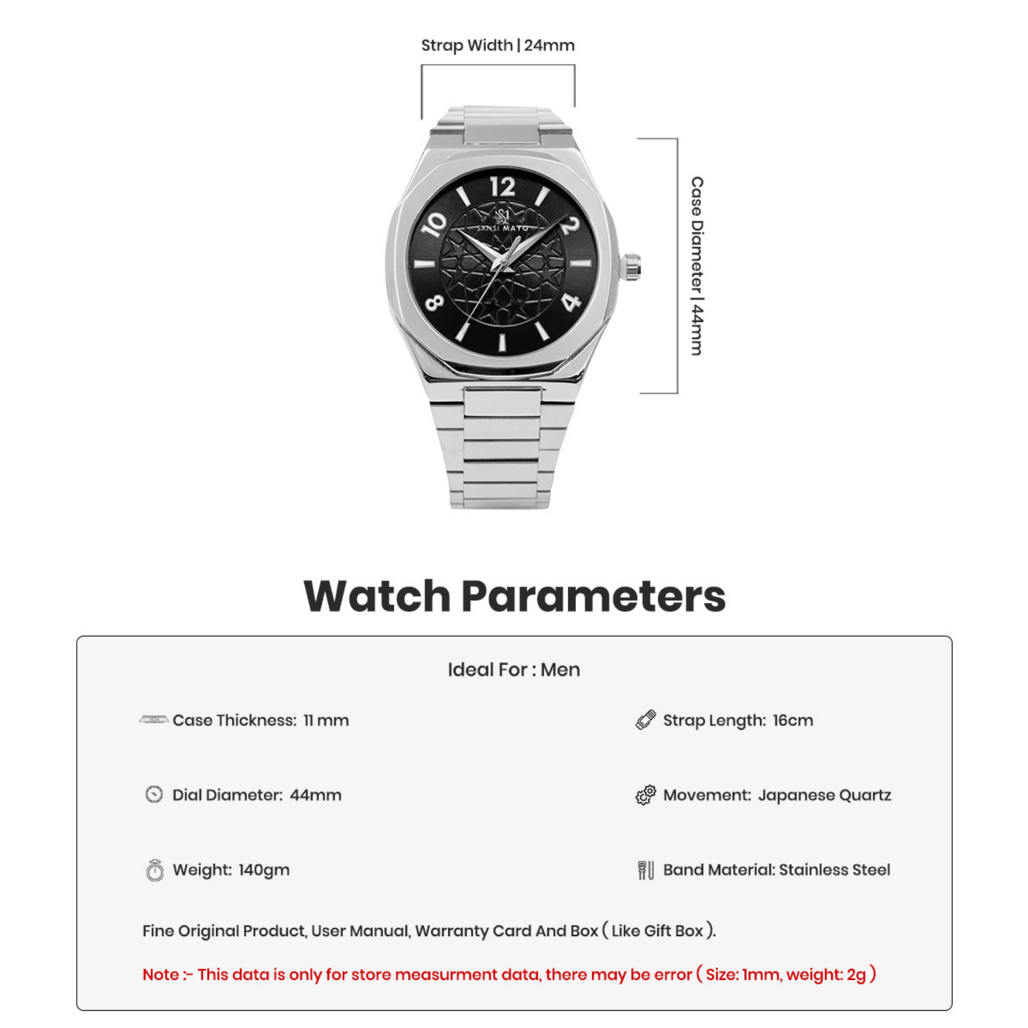 Experience modern elegance with the Sansi Mayo Silver Noir Wrist Watch. Featuring a round alloy case with sleek IPS plating, a striking black dial, and a polished steel band, this timepiece offers a bold yet refined look. Powered by precise Japan movement and battery, and with 3 ATM water resistance, it combines sophisticated style with dependable performance.