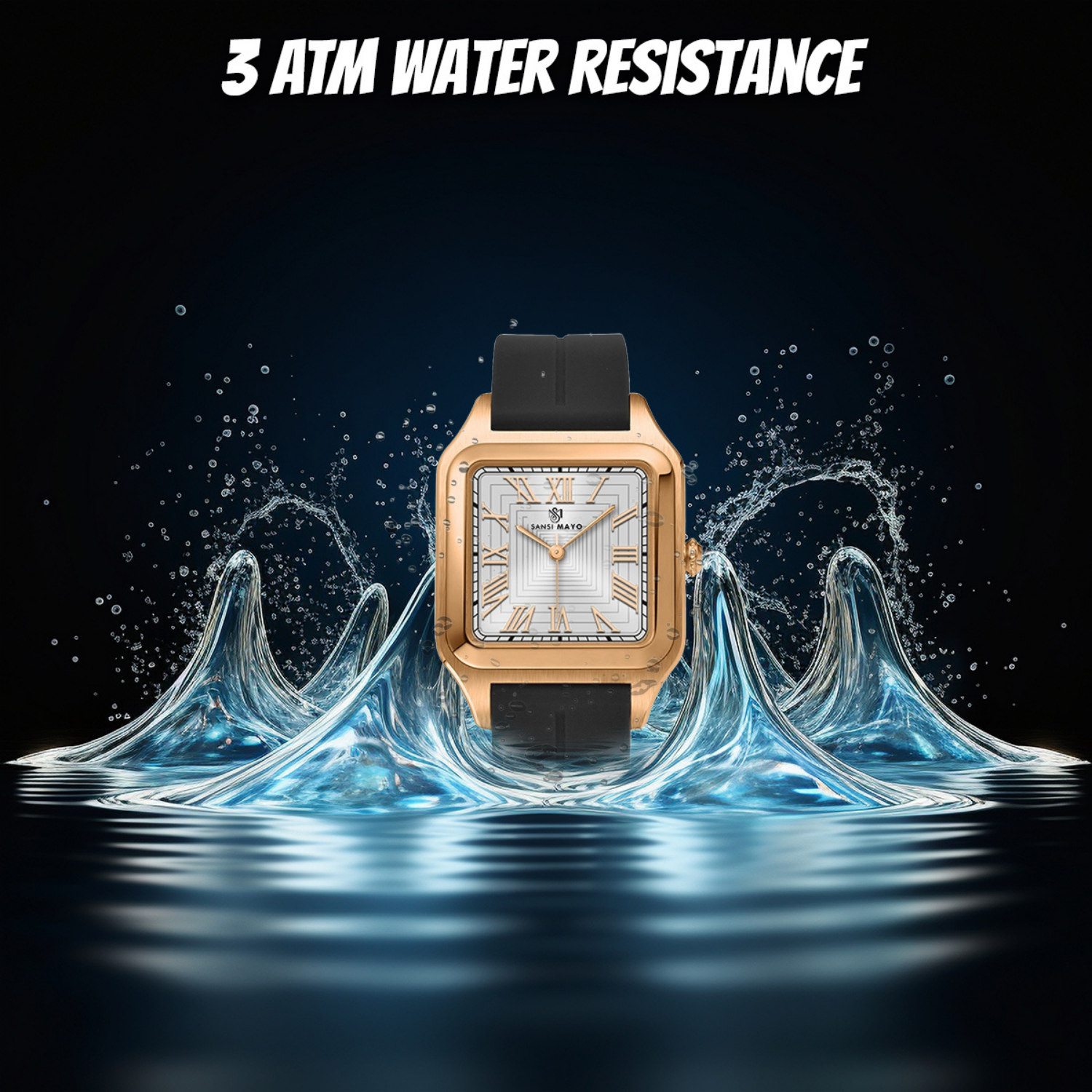 This Sansi Mayo men's watch offers a striking contrast with its black silicone strap and crisp white dial, housed in a modern square stainless steel case. Powered by a reliable quartz movement and backed by a 1-year warranty.