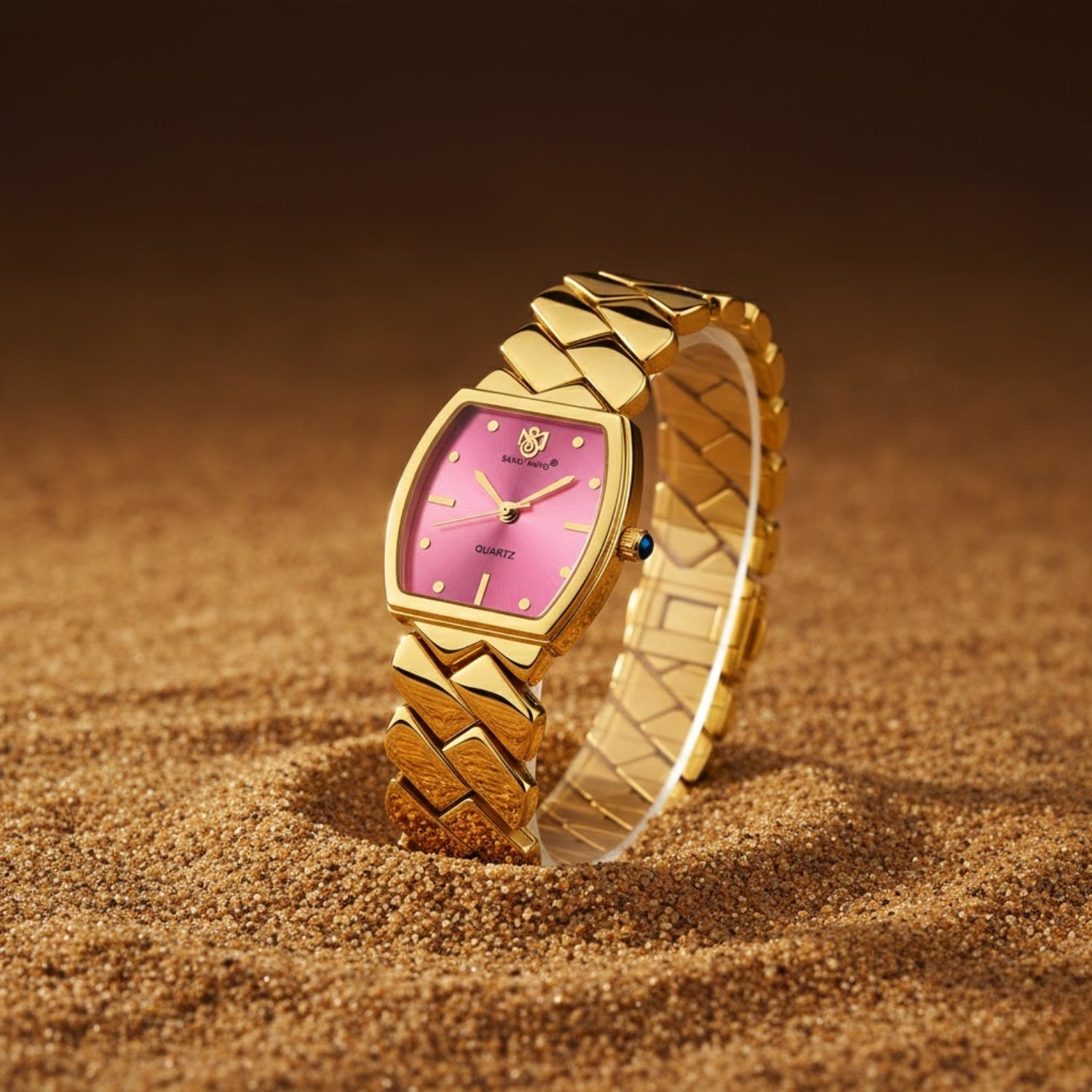 Unveil the Sansi Mayo NIXIE Gold Dark Pink Dial Watch — a masterpiece of modern luxury and craftsmanship. Designed for the woman who appreciates timeless beauty, this NIXIE model blends sophistication and strength with its golden stainless steel body and a captivating dark pink dial that exudes confidence and charm.