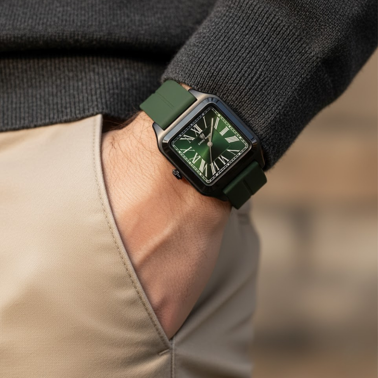 Embrace a natural and stylish look the Sansi Mayo men's green on green silicone watch. The earthy green tones of the strap and matching dial create a cohesive and eye-catching design. The square case adds a contemporary touch. Powered by a precise quartz movement for accurate timekeeping and backed by a 1-year warranty.