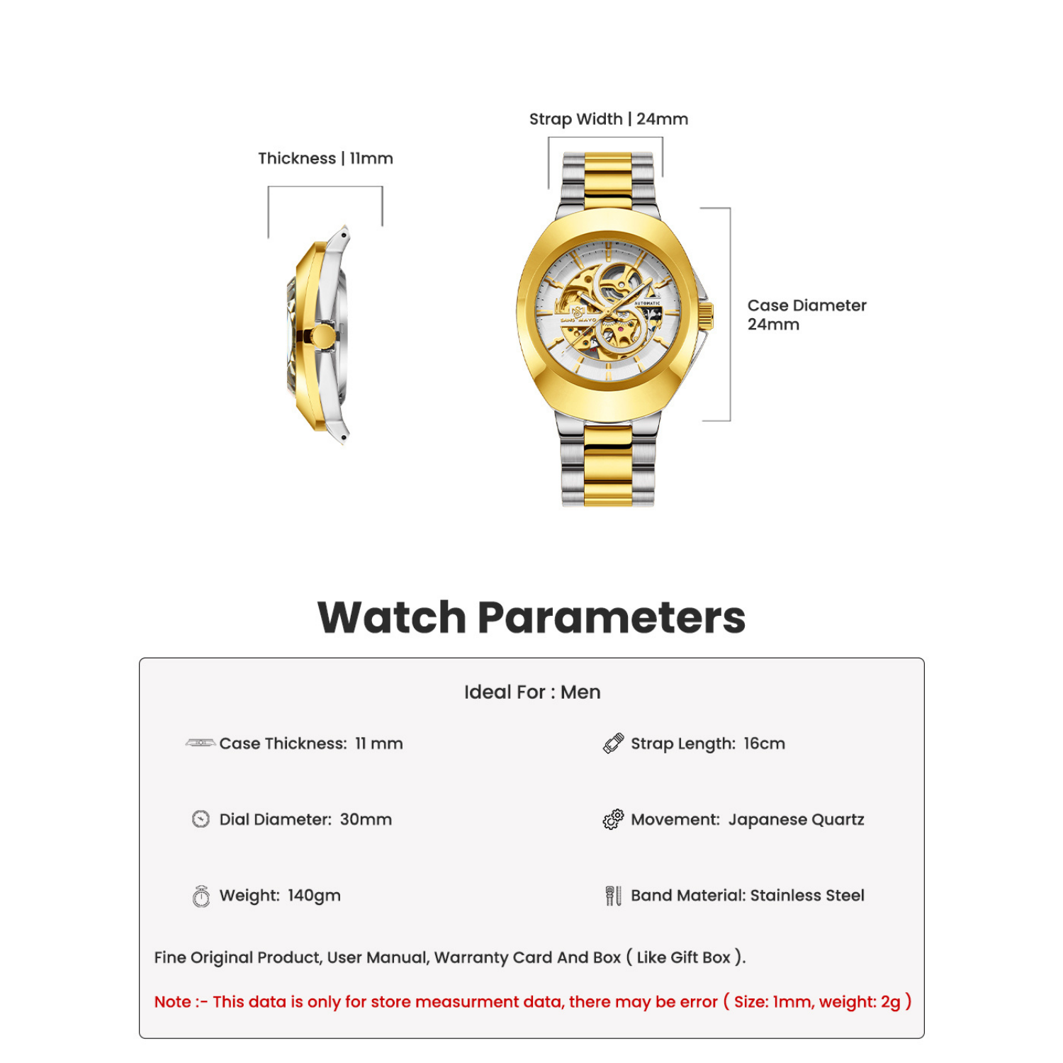 The Sansi Mayo Dual-Tone Automatic Watch is where classic design meets mechanical excellence. Featuring a white open-heart dial, self-winding movement, and a sophisticated two-tone bracelet — this timepiece embodies effortless luxury for the modern man.