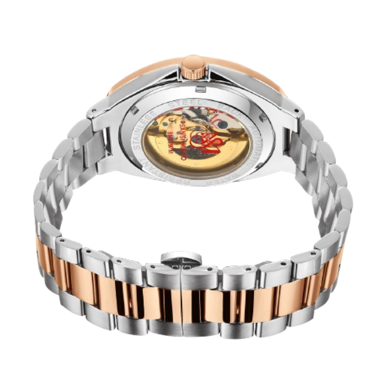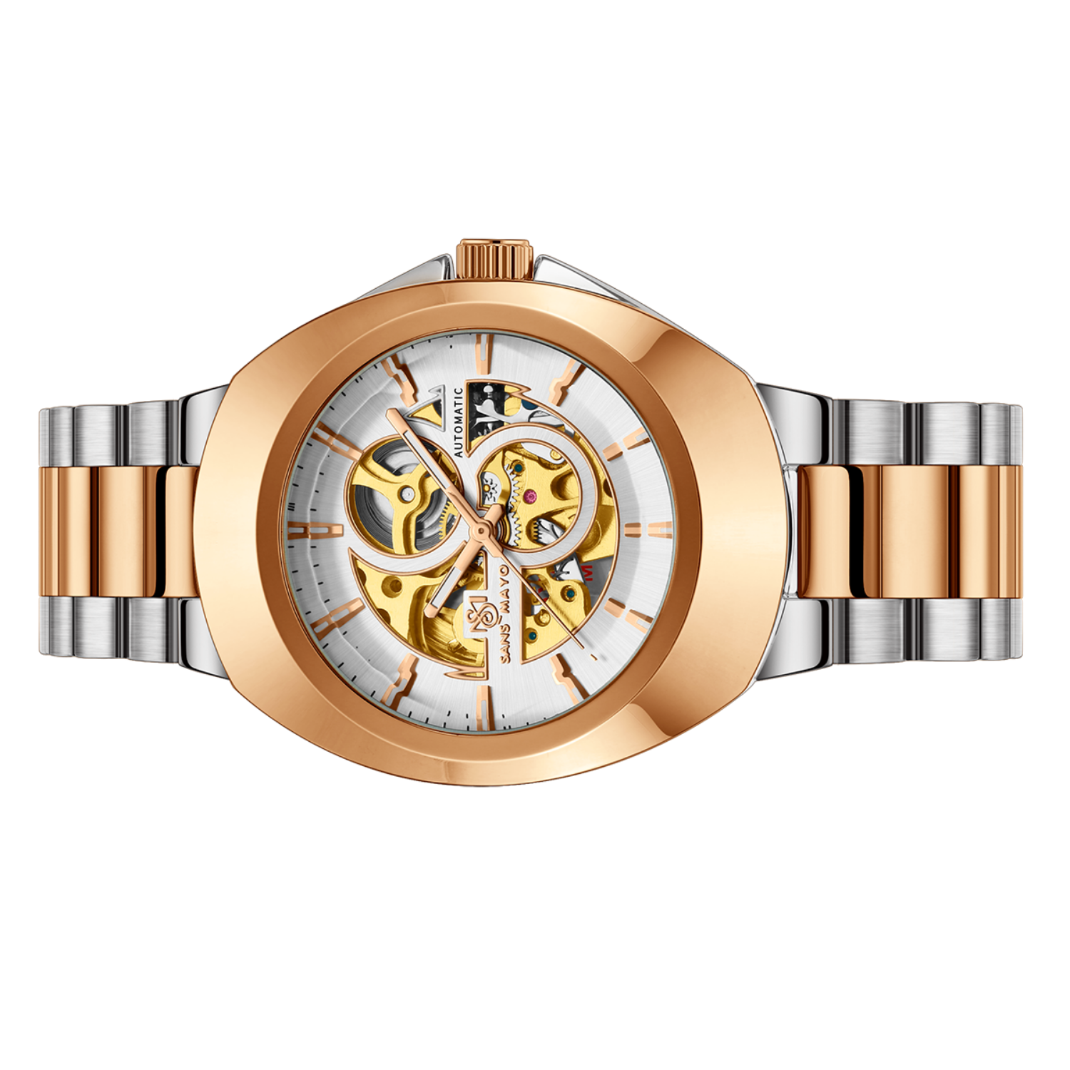 Refined in every detail, this Sansi Mayo Automatic Watch blends the art of self-winding movement with a striking white dial and dual-tone rose gold & silver finish. The open-heart feature offers a glimpse into the soul of your timepiece — turning everyday moments into lasting impressions.