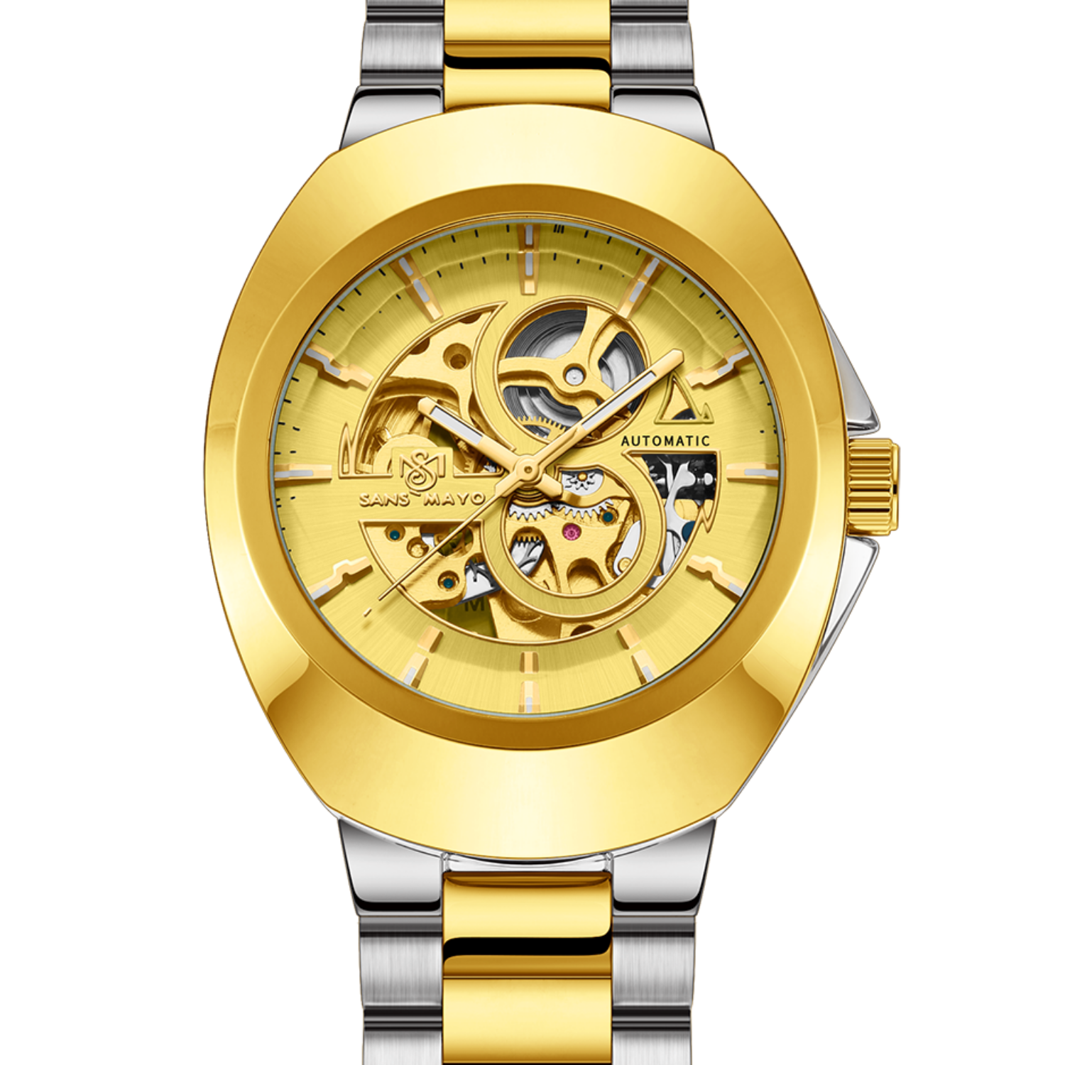 Crafted for the connoisseur of bold elegance, the Sansi Mayo Dual Tone (Gold & Silver) Edition blends traditional horology with modern sophistication — featuring an open-heart dial, self-winding movement, and a luminous gold finish that commands attention.