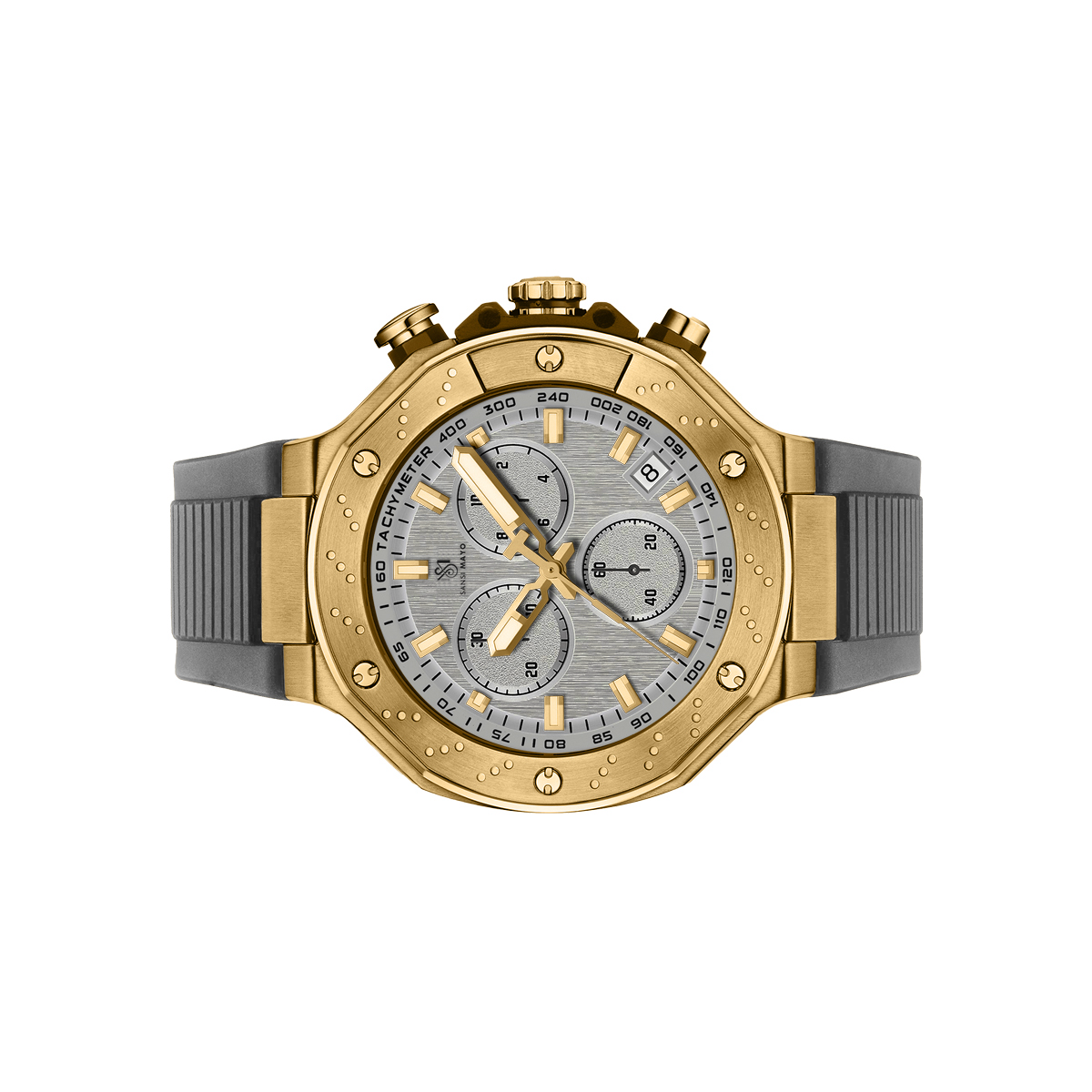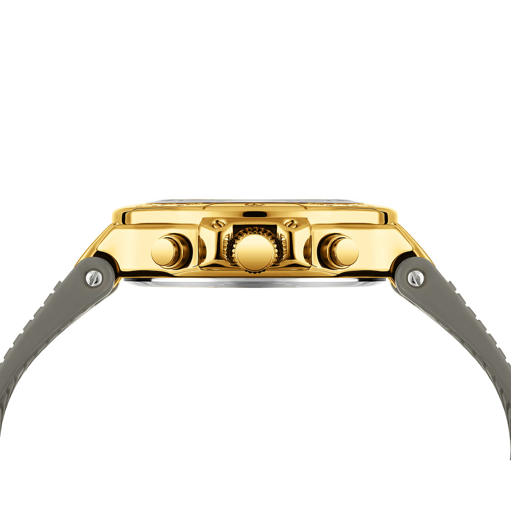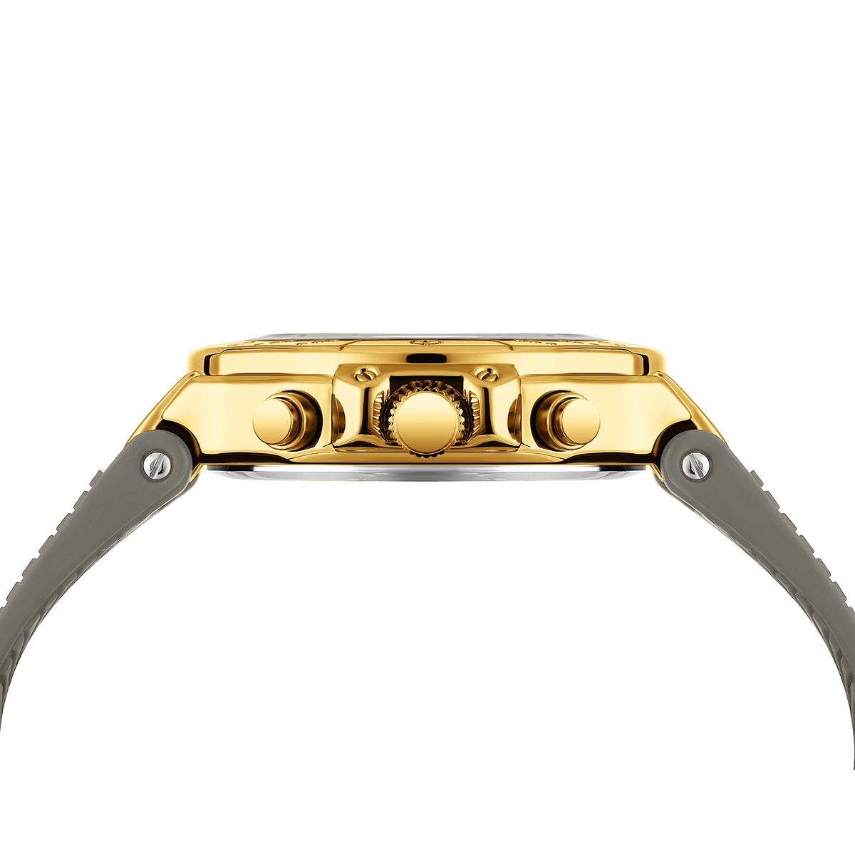 The matte grey silicone strap offers lasting comfort, while the gold-tone stainless steel case adds a rich contrast. Whether you're dressing for work or play, this watch enhances your look with precision and character.