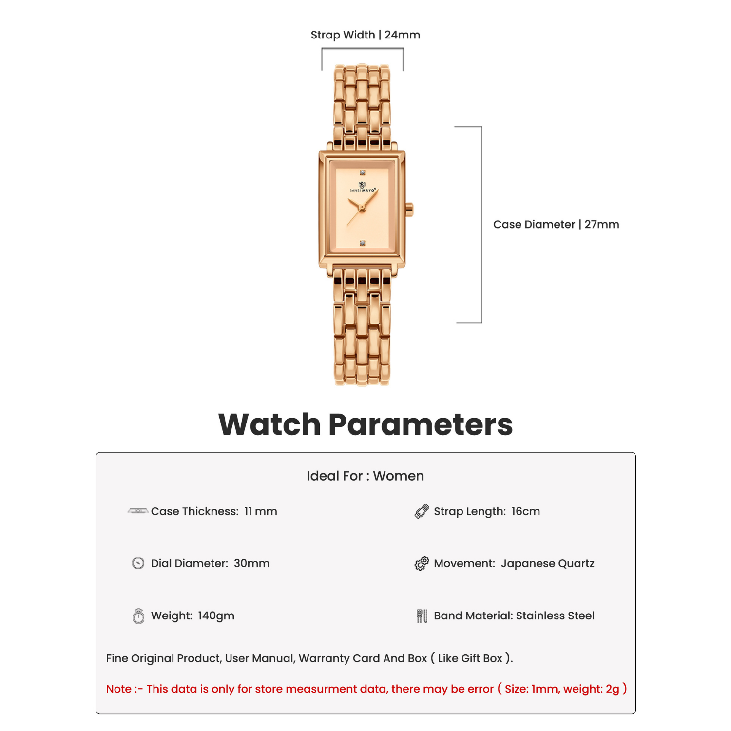 Elevate your wristwear with the Sansi Mayo Women's Square Rose Gold & White Wrist Watch. Featuring a crisp white dial accented by a luxurious rose gold stainless steel band, this square-shaped timepiece perfectly blends modern elegance with timeless style.