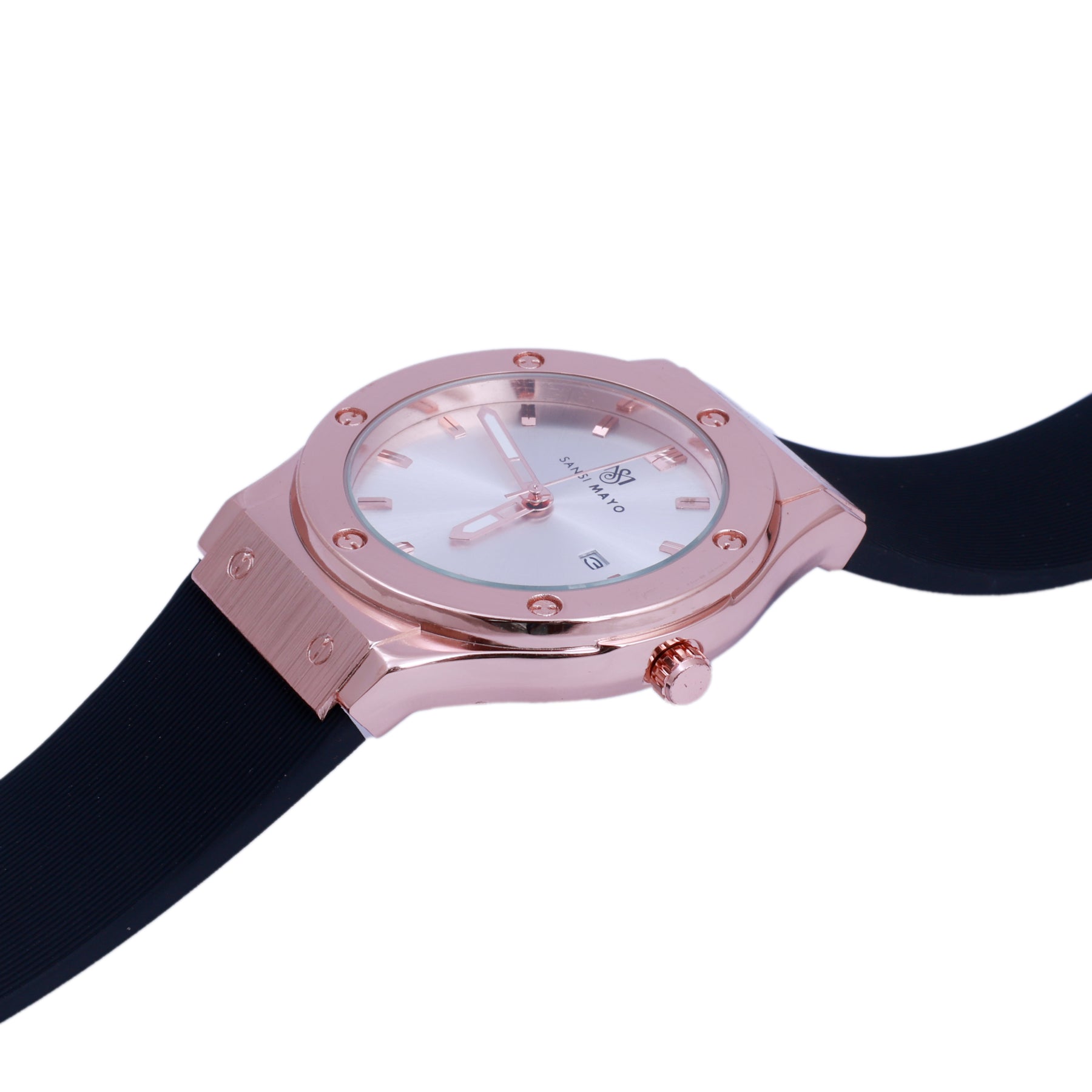The Sansi Mayo Round Gold & White Wrist Watch features an elegant round alloy case with IP rosegold plating and a sleek silicon band. Its crisp white dial is powered by precise Japan movement and a reliable Japan battery. With 3 ATM water resistance, this watch offers a sophisticated look combined with practical functionality for everyday wear.
