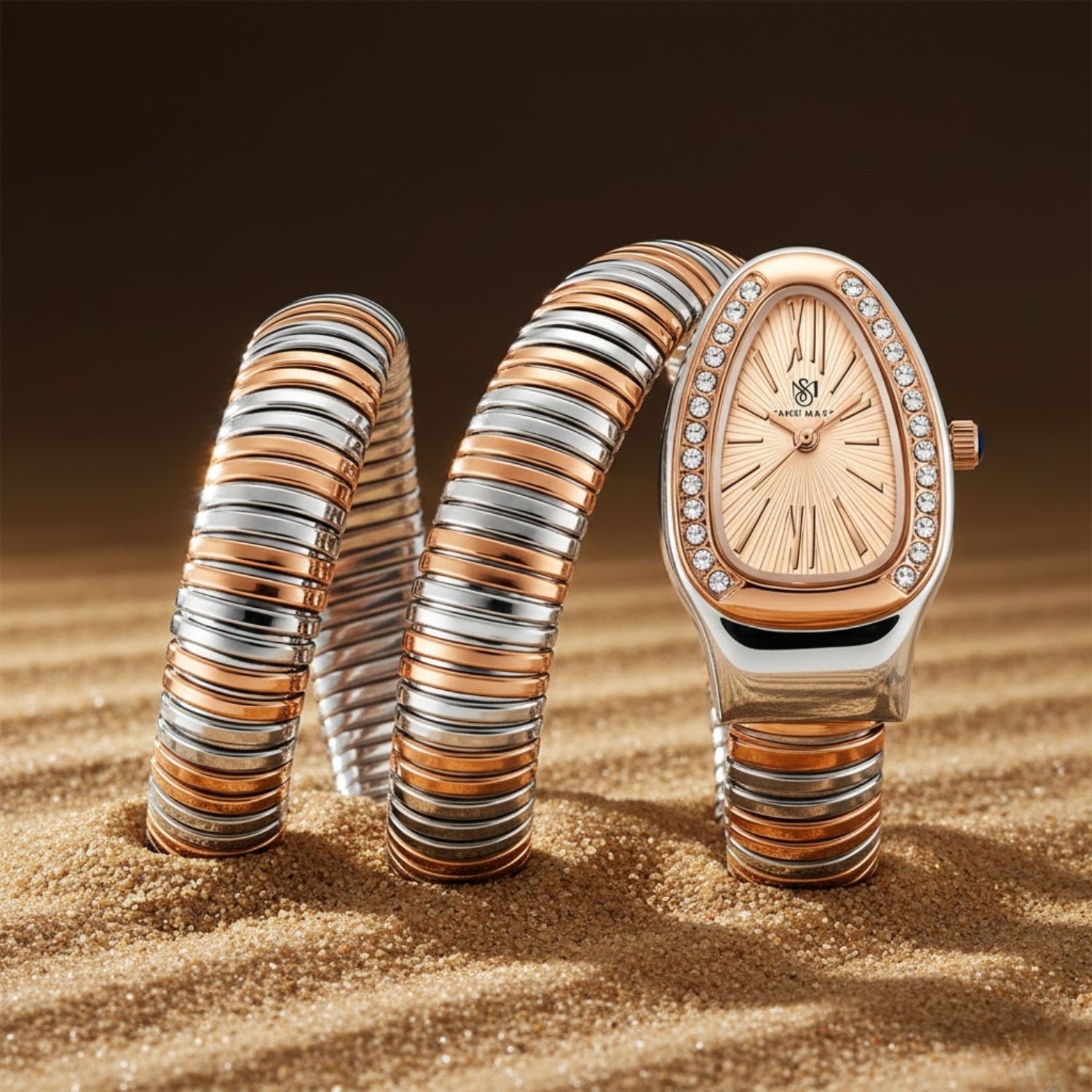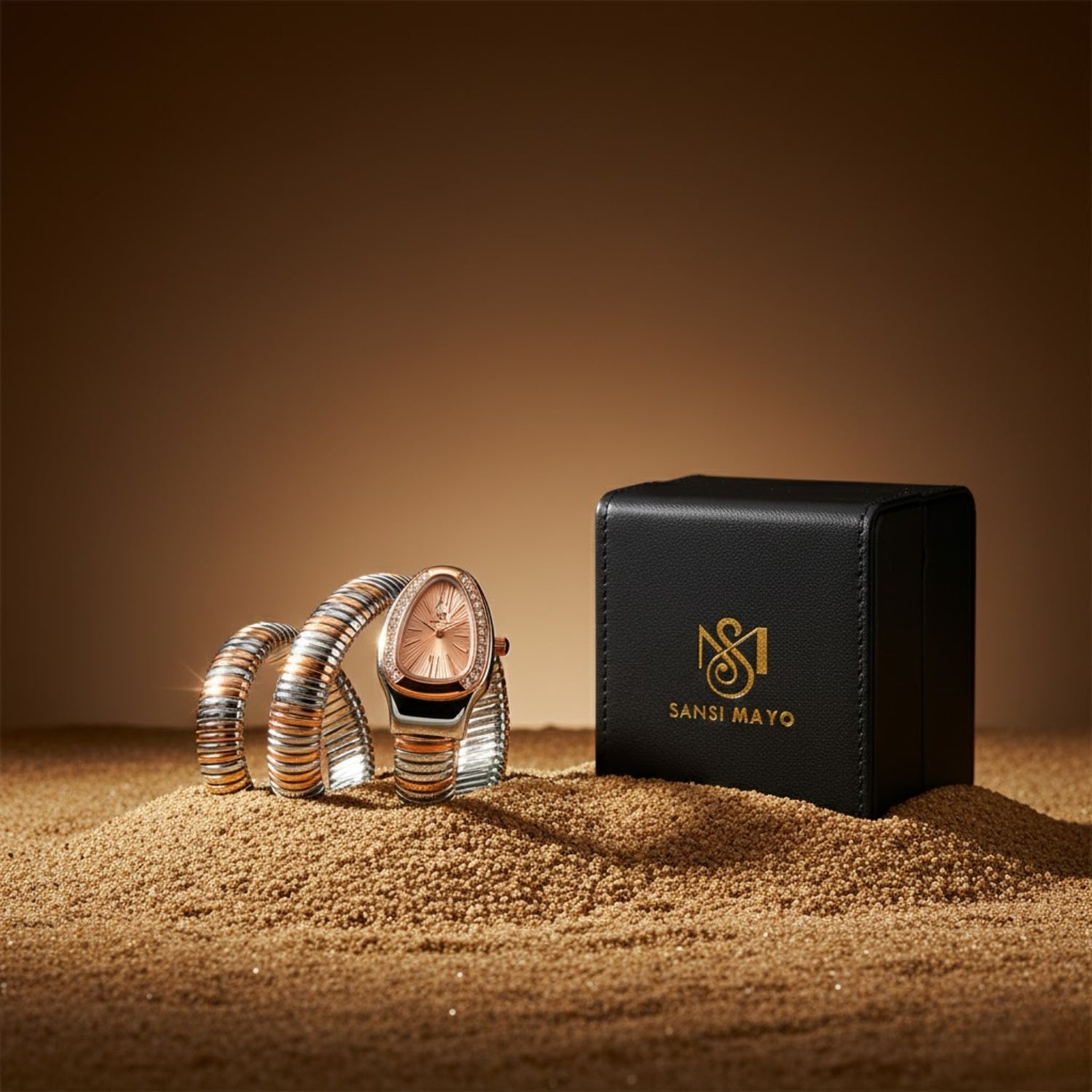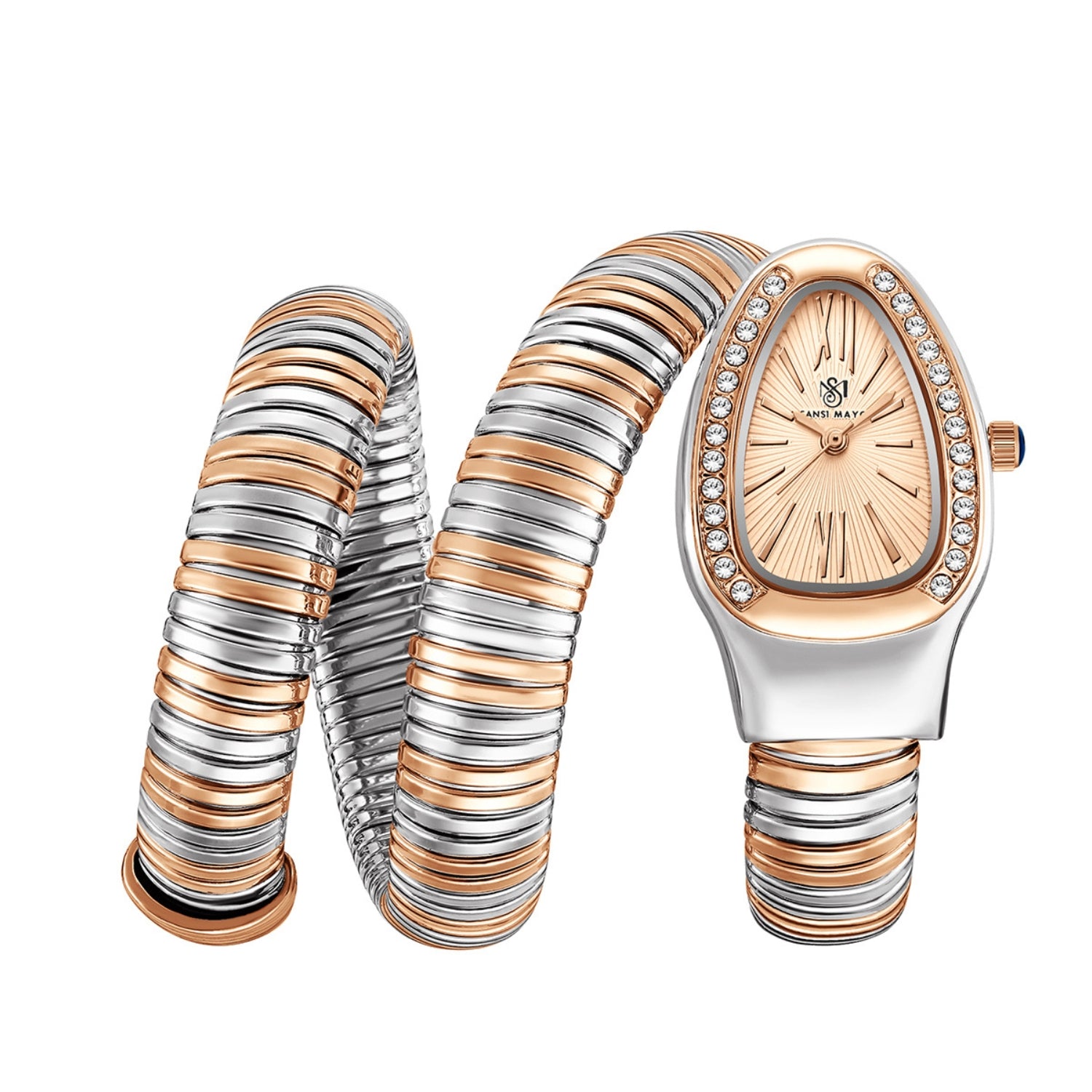 The Sansi Mayo Snake 2.0 Two-Tone Silver Rose Gold Edition is designed for women who love refined luxury with effortless comfort. Featuring a radiant rose gold dial and a flexible snake-style coil bracelet, this timepiece blends jewelry aesthetics with modern watchmaking.