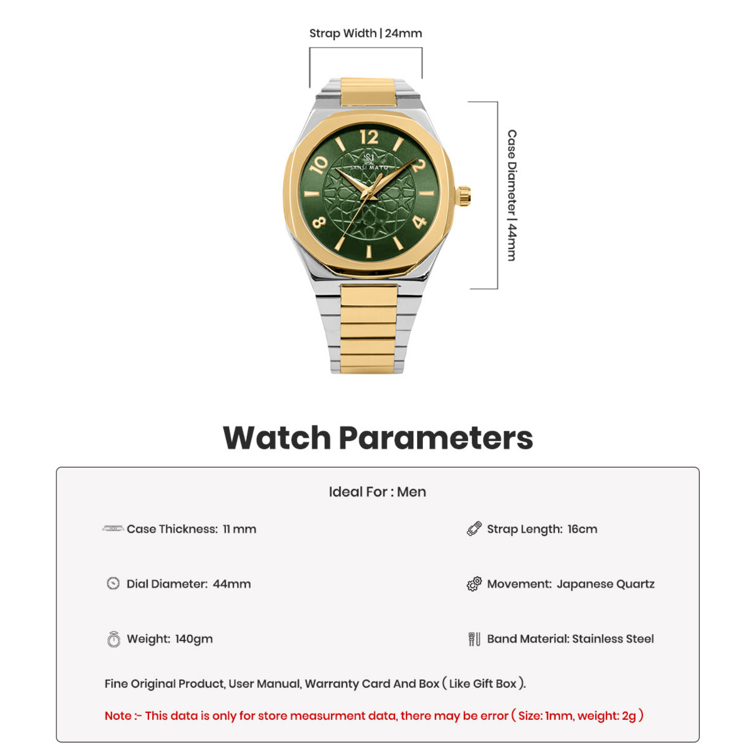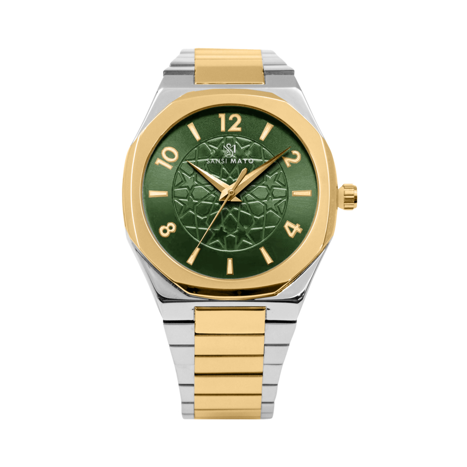 Discover the perfect balance of style and sophistication with the Sansi Mayo Two-Tone Gold & Green Harmony Wrist Watch. Featuring a round alloy case with an elegant mix of IPS and IP gold plating, a striking green dial, and a sleek steel band, this watch exudes luxury. Powered by precise Japan movement and battery, and with 3 ATM water resistance, it offers both refined design and dependable performance.