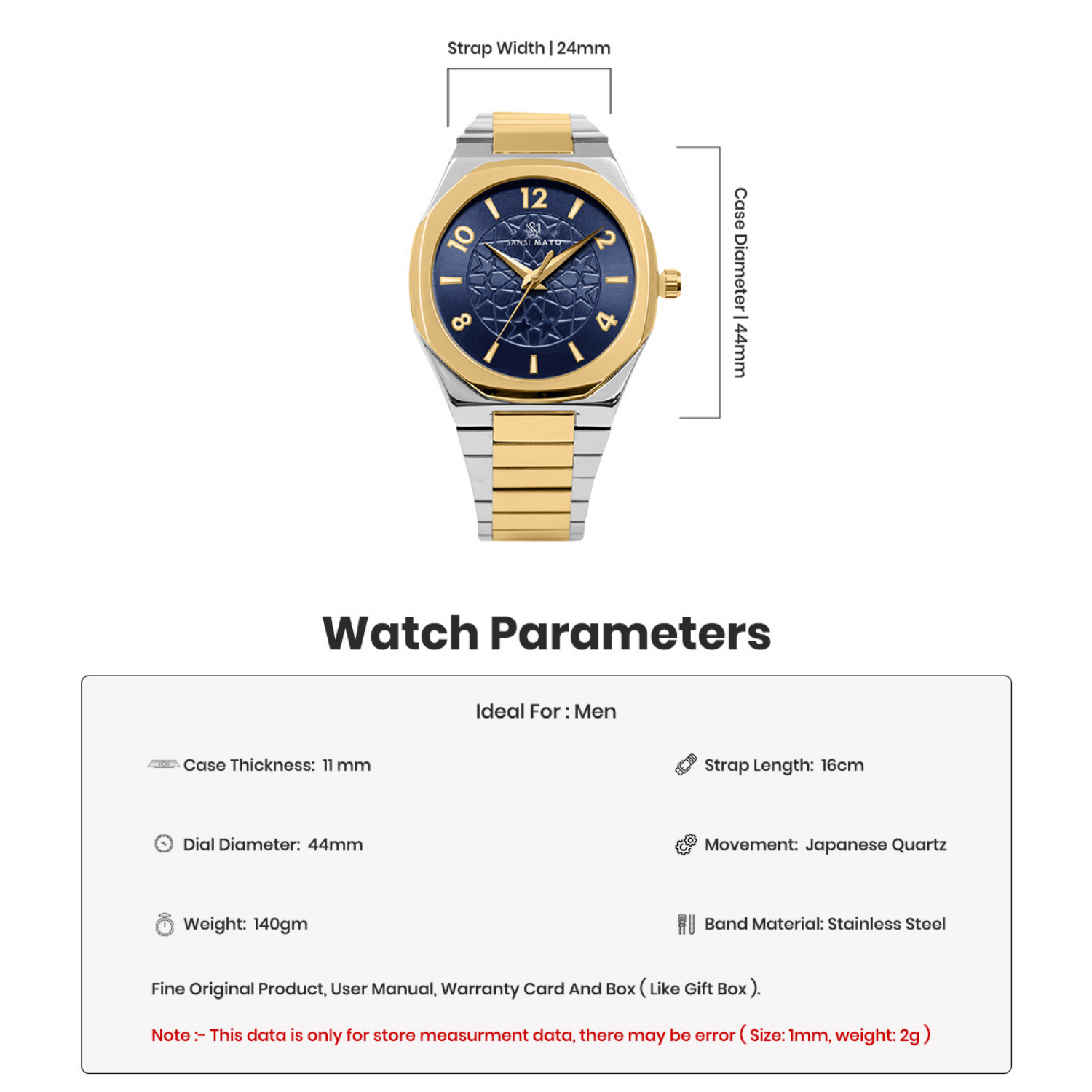 Introducing the Sansi Mayo Two-Tone Gold & Blue Prestige Wrist Watch. Featuring a round alloy case with a refined mix of IPS and IP gold plating, a vibrant blue dial, and a sleek steel band, this watch blends elegance with modern style. Equipped with precise Japan movement and battery, and offering 3 ATM water resistance, it combines standout design with reliable functionality.