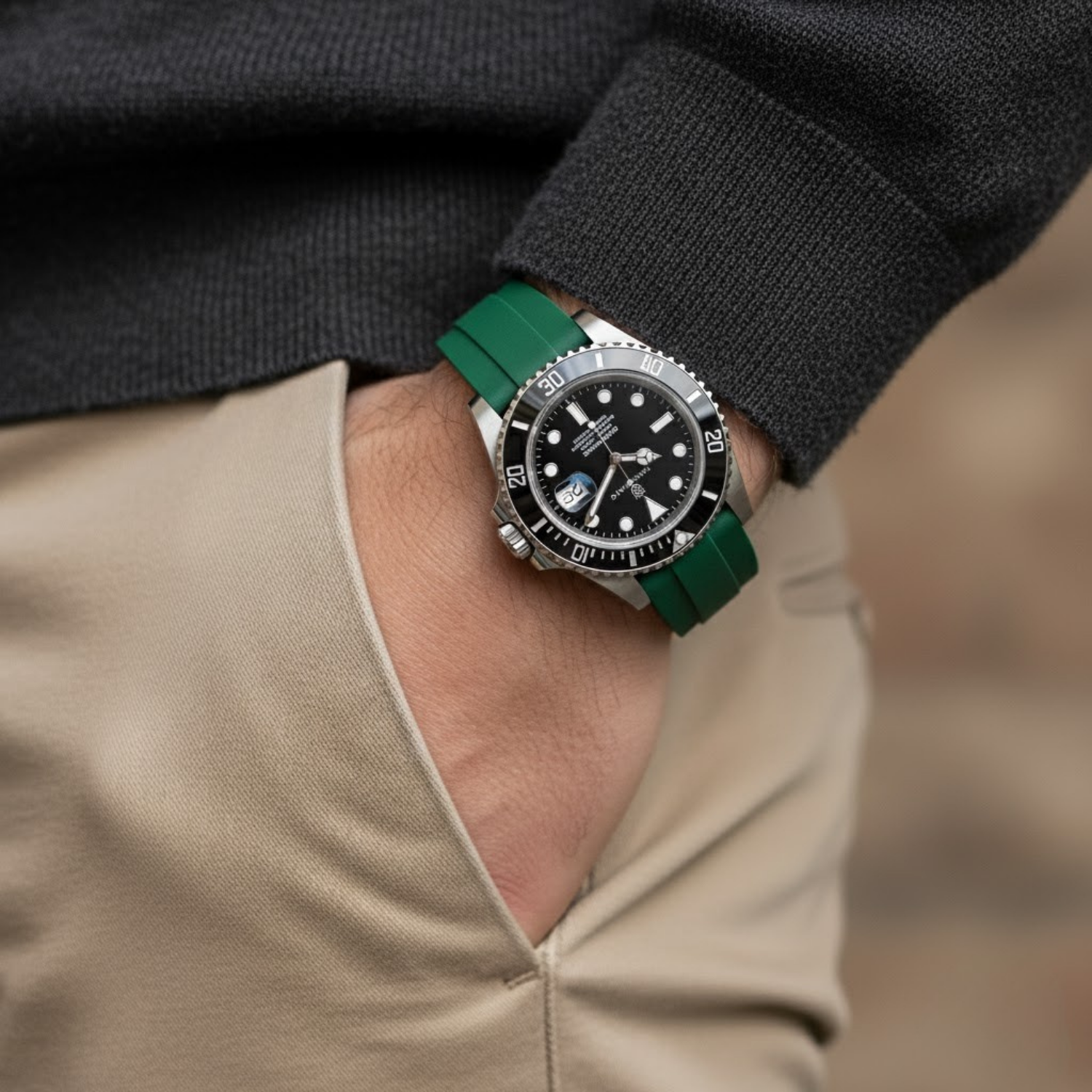 • Elegant two-tone design with a black dial and green silicone strap