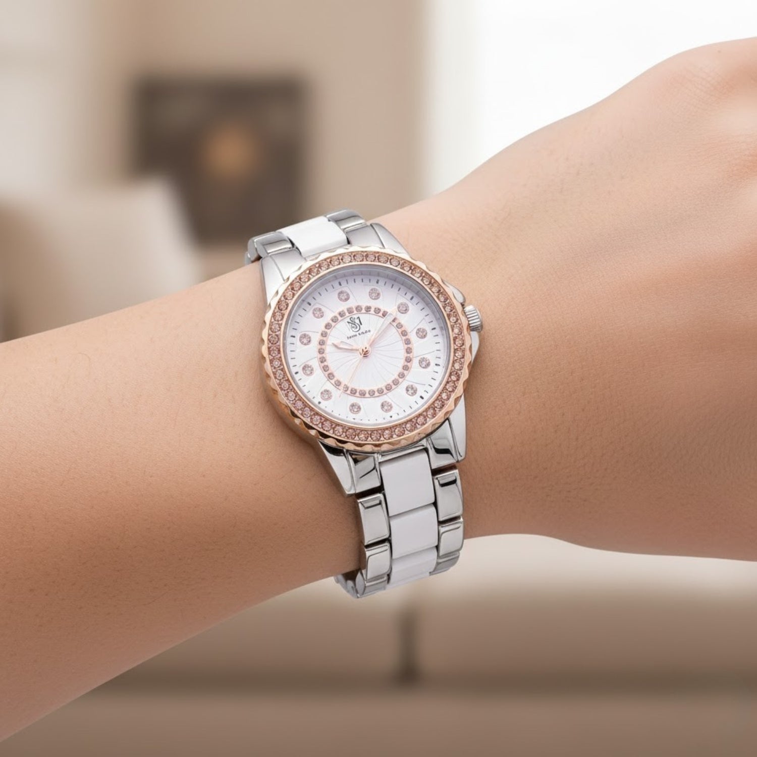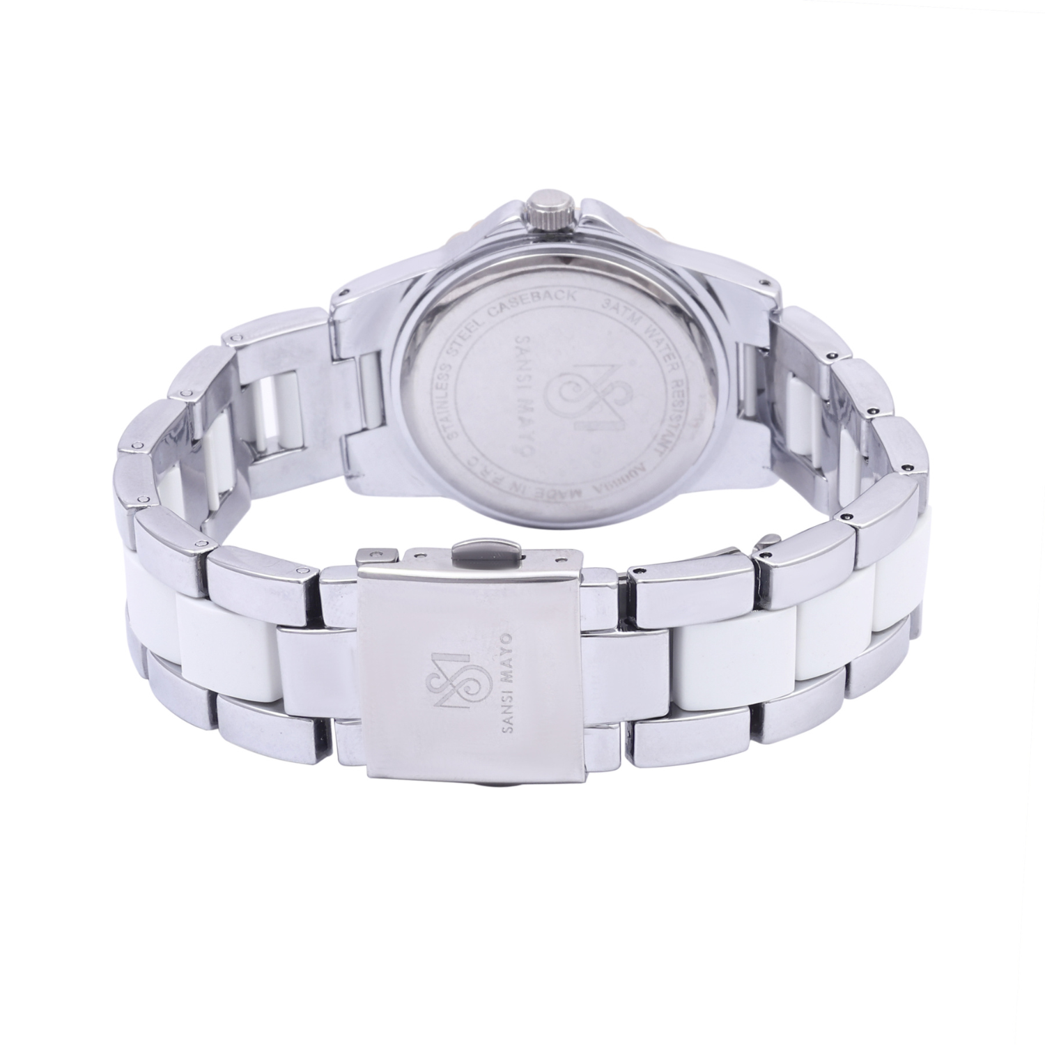Introducing the Sansi Mayo Round Two Tone Wrist Watch in Rosegold, a statement of sophistication and style. This watch features a round alloy case with IPS + IP white plating and an exquisite IP rosegold case finish, blending elegance with contemporary design. The steel band offers durability and comfort, ensuring it stands the test of time. Powered by a precise Japan movement and equipped with a Japan battery, this watch guarantees reliable and accurate timekeeping. With a 3 ATM water resistance rating, it is resistant to water splashes and brief immersion, making it suitable for everyday use. Elevate your wristwear with the Sansi Mayo Round Two Tone Wrist Watch - Rosegold, a perfect choice for both casual and formal occasions.
