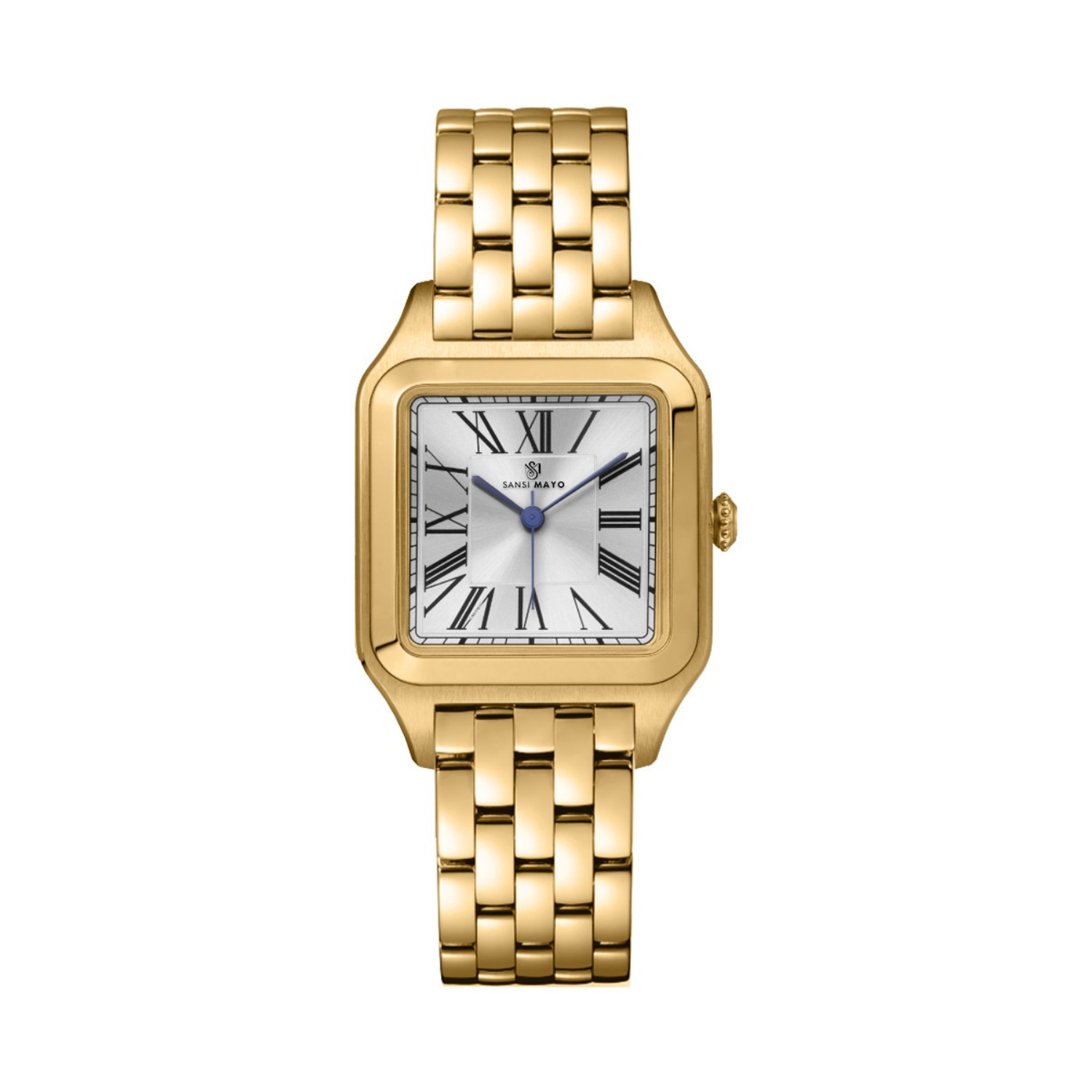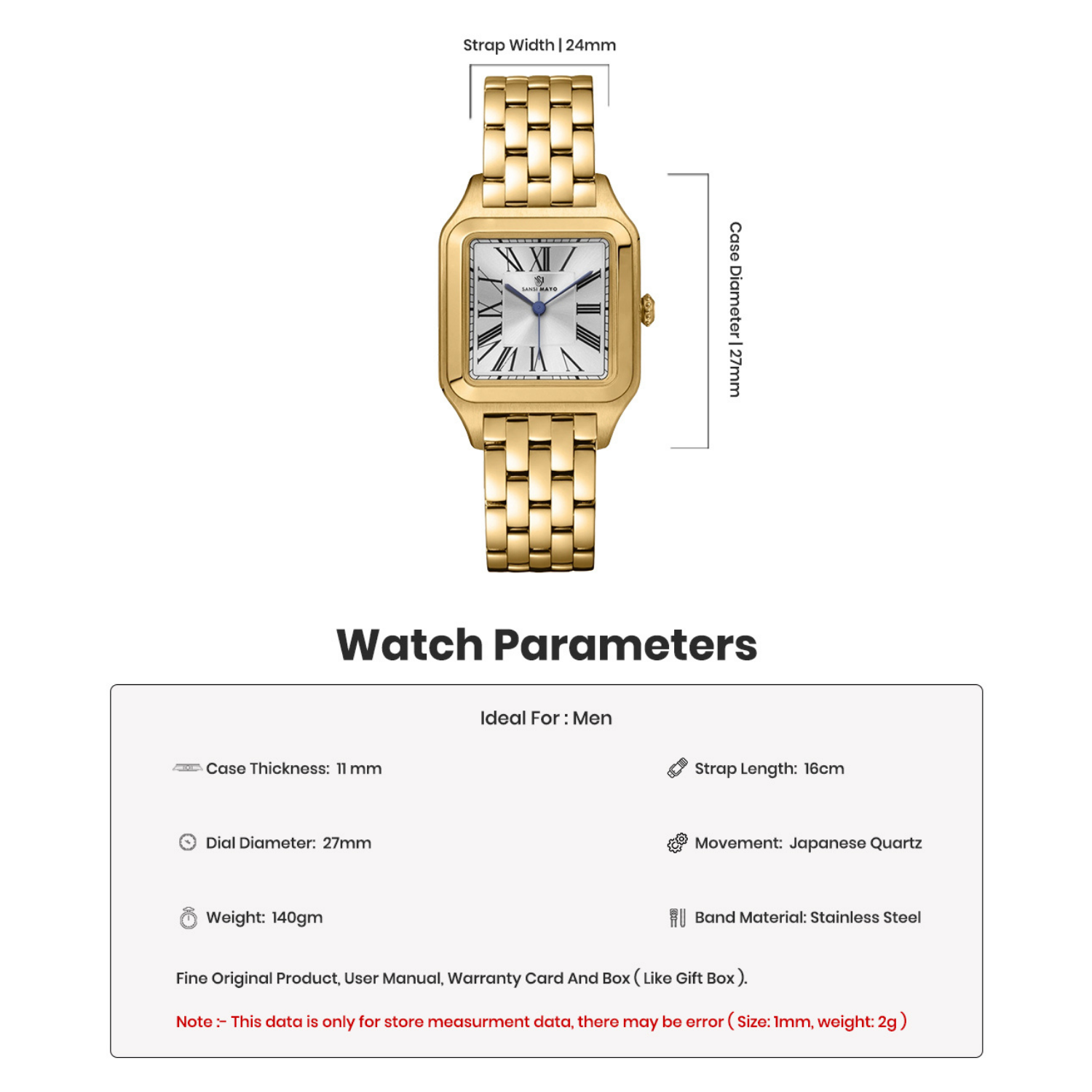Step into timeless sophistication with the Sansi Mayo men's square white and gold watch. Featuring a crisp white dial paired with a luxurious gold stainless steel band, this timepiece is perfect for both formal and everyday elegance. Roman numeral accents and Japanese Quartz movement ensure style meets functionality.
