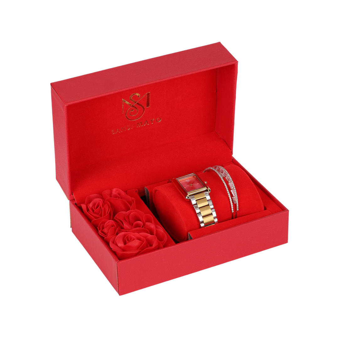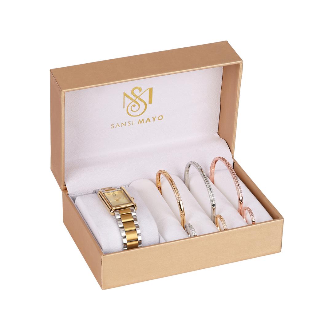Sansimayo Women’s Rectangle Gold Dial Watch with 2 Bracelet Set – Two Tone Silver Gold