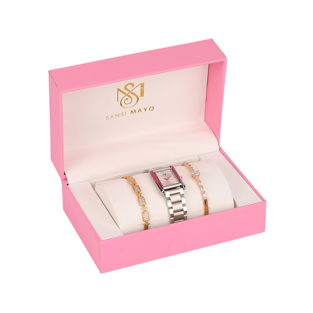 Sansi Mayo Women’s Watch & Jewellery Gift Set — Silver with Light Pink Dial & Egyptian Stone