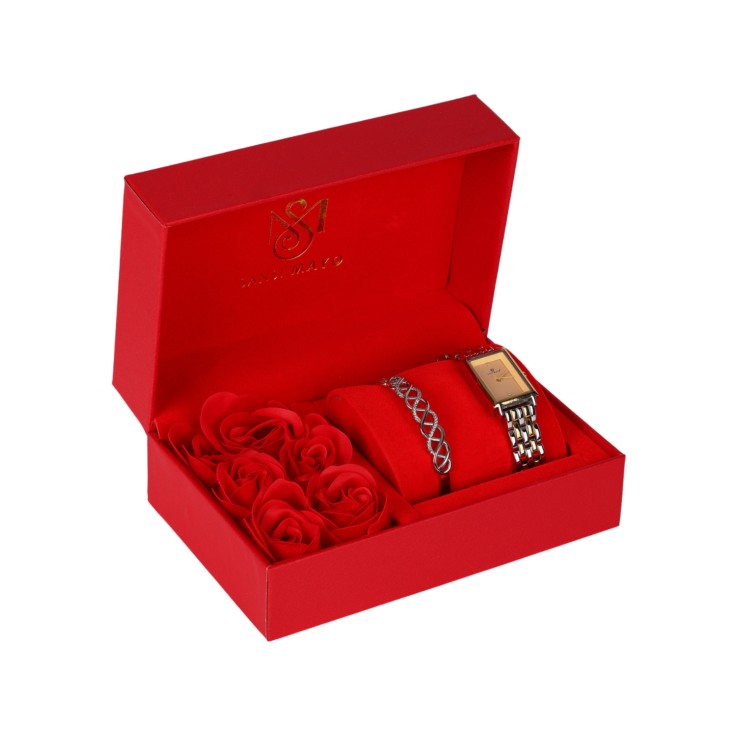 The Sansimayo Women’s Grey Dial Watch with Bracelet is a luxurious timepiece designed to complement any look. Made from premium stainless steel, this watch showcases a Grey dial adorned with Crystal Egyptian Stones that bring timeless charm. Finished in Two Tone Silver Gold, it comes with a matching bracelet for a coordinated and elegant appearance. Featuring Japanese Quartz movement and 3 ATM water resistance, this set is perfect for both daily wear and special occasions.