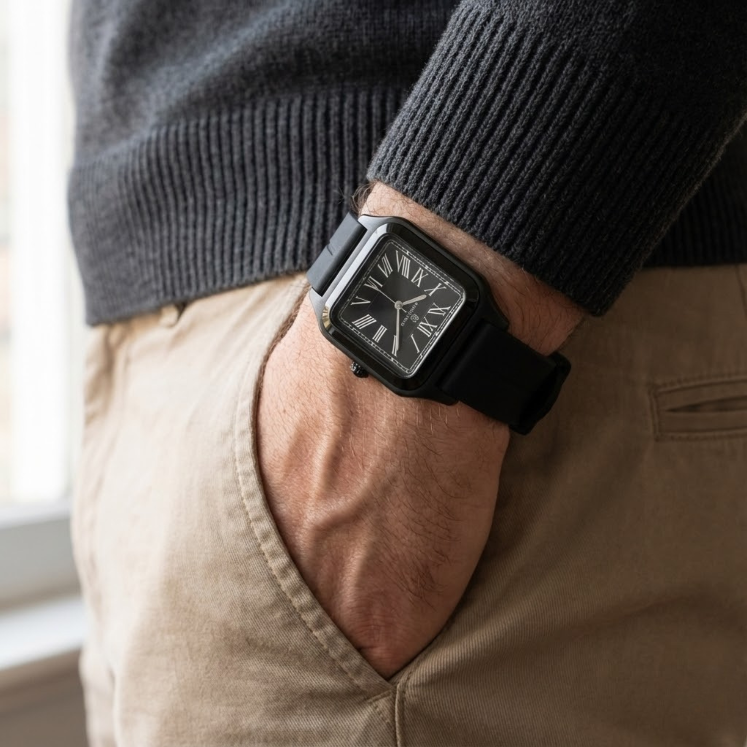 Sansi Mayo Men's All-Black Silicone Square Case Watch - Modern and Understated Style