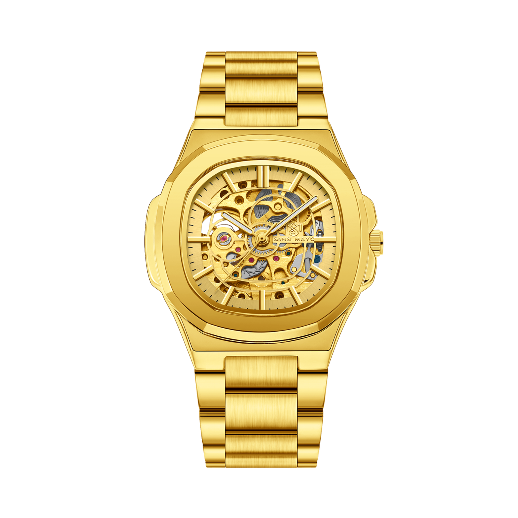 Command attention with the Sansi Mayo Zeus Gold Automatic. Featuring a striking square gold case, unified gold dial and strap, and self-winding mechanics, this timepiece blends timeless craftsmanship with modern prestige. Built from stainless steel with premium IP 30 gold plating, it’s a watch that embodies strength, luxury, and everyday reliability.