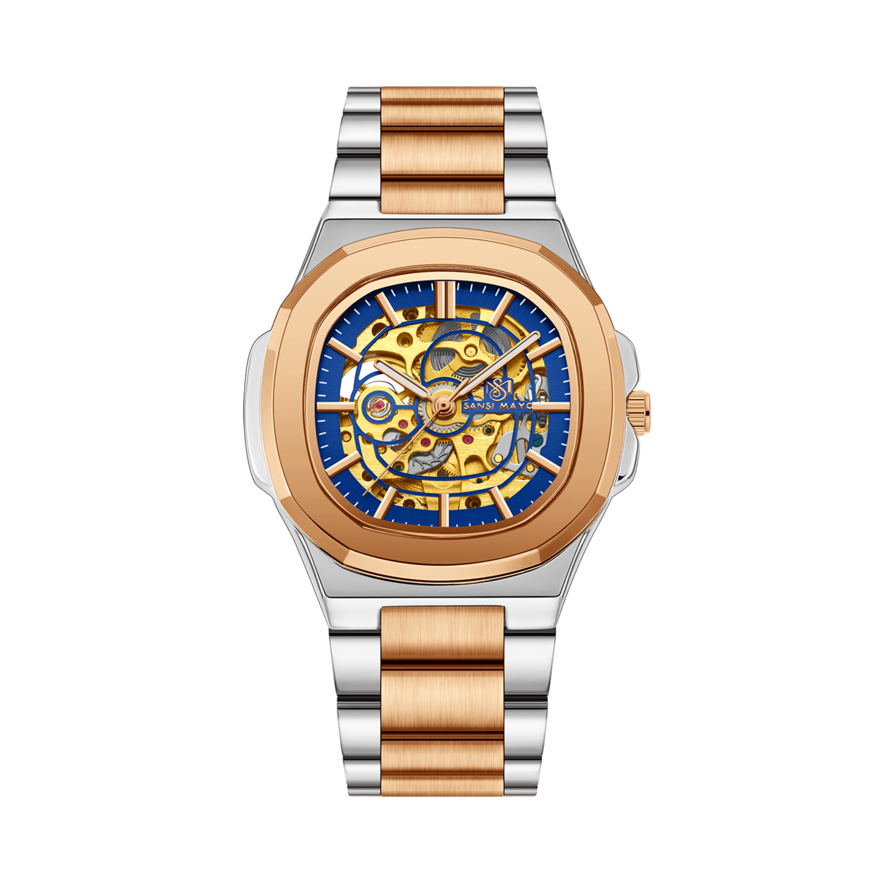 Command attention with the Sansi Mayo Zeus Automatic Watch in dual-tone rose gold and silver. Featuring a striking blue-gold dial, self-winding movement, and a square stainless steel case, this timepiece balances bold modern design with the timeless art of mechanical watchmaking.
