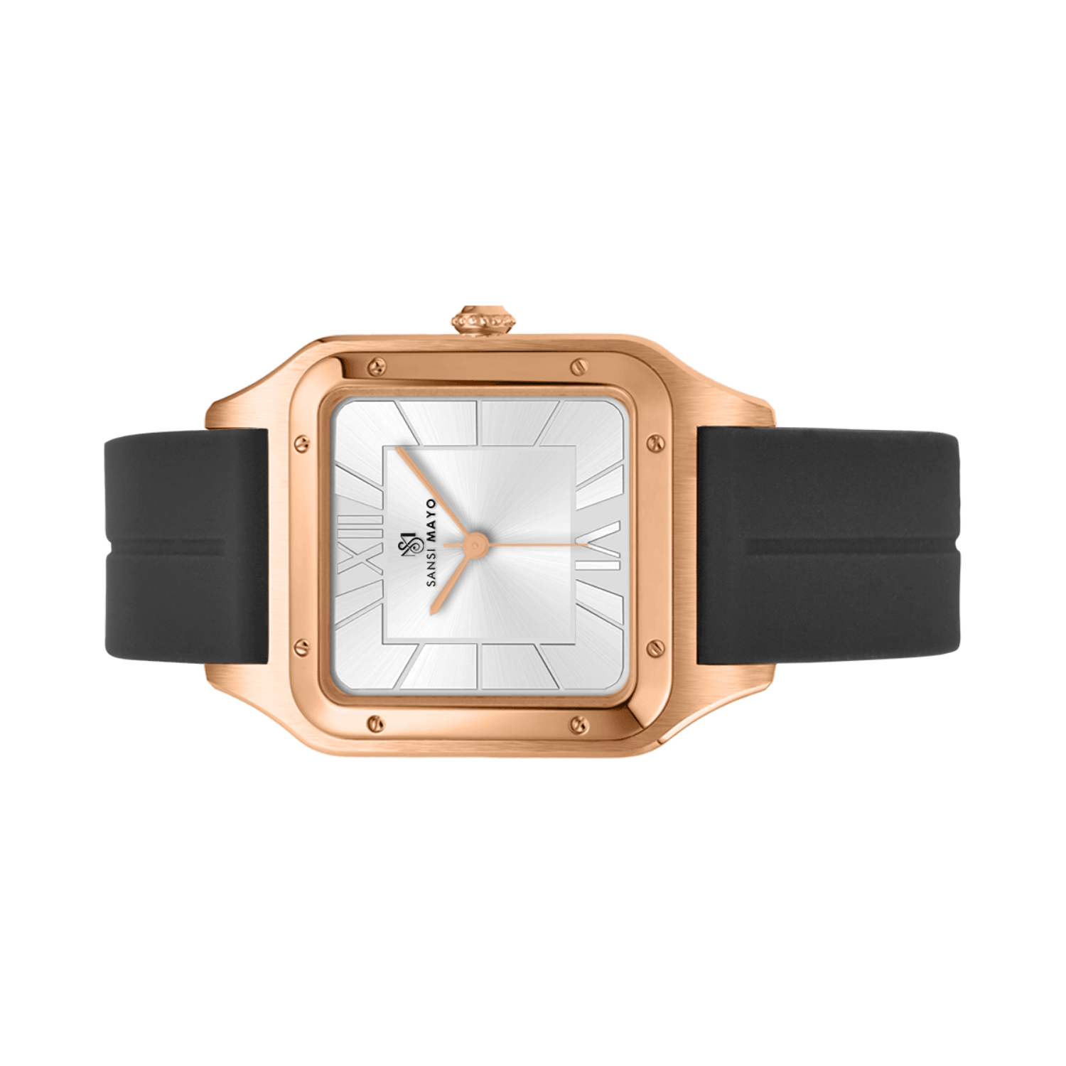 This Sansi Mayo men's watch offers a striking contrast with its black silicone strap and crisp white dial, housed in a modern square stainless steel case. Powered by a reliable quartz movement.