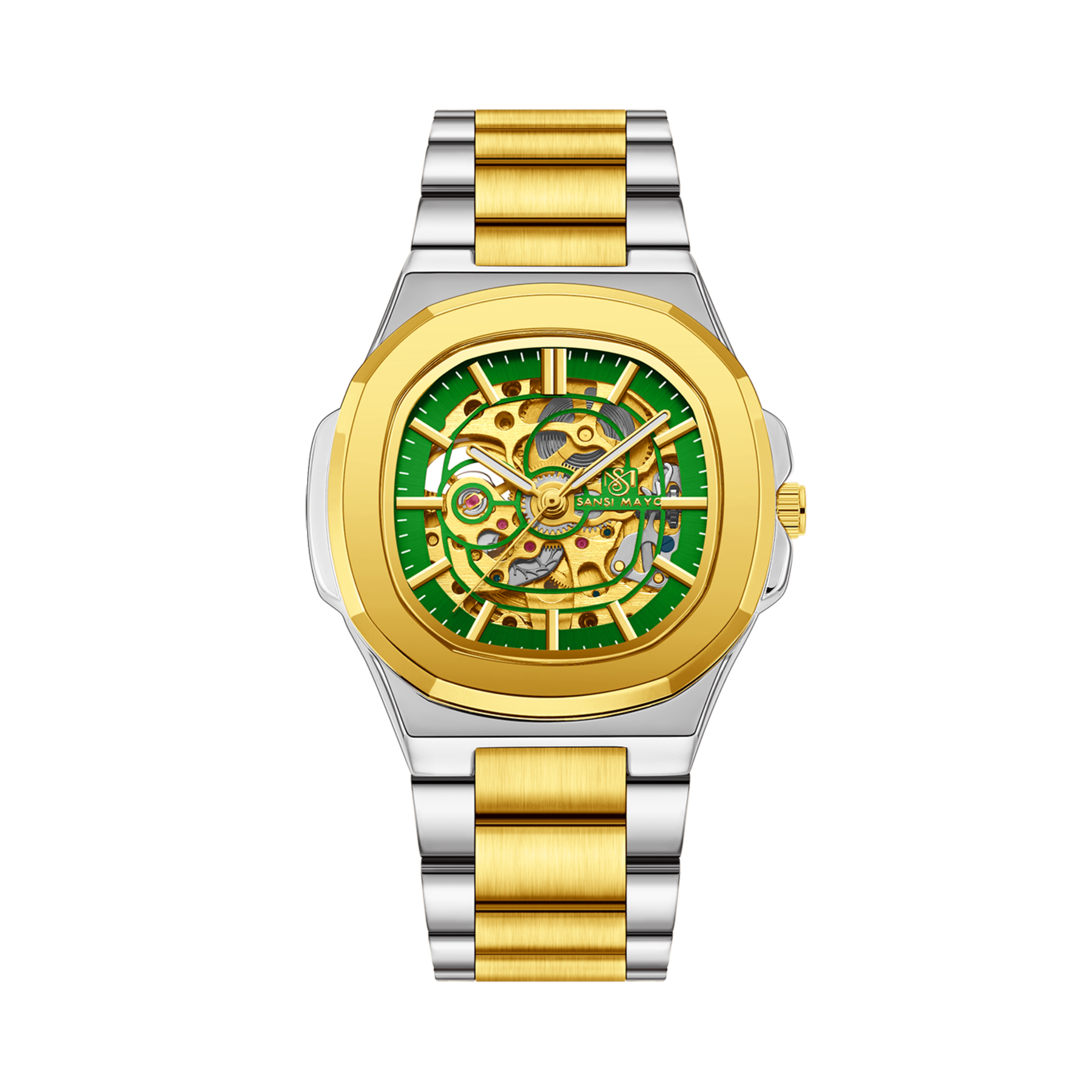 Step into bold sophistication with the Sansi Mayo Zeus Green Gold Edition. This square-shaped automatic watch features a striking open-heart green-gold dial, a rose-gold plated stainless steel case, and a dual-tone silver & rose-gold bracelet. With self-winding mechanics and timeless styling, it’s crafted for men who appreciate confidence in every detail.