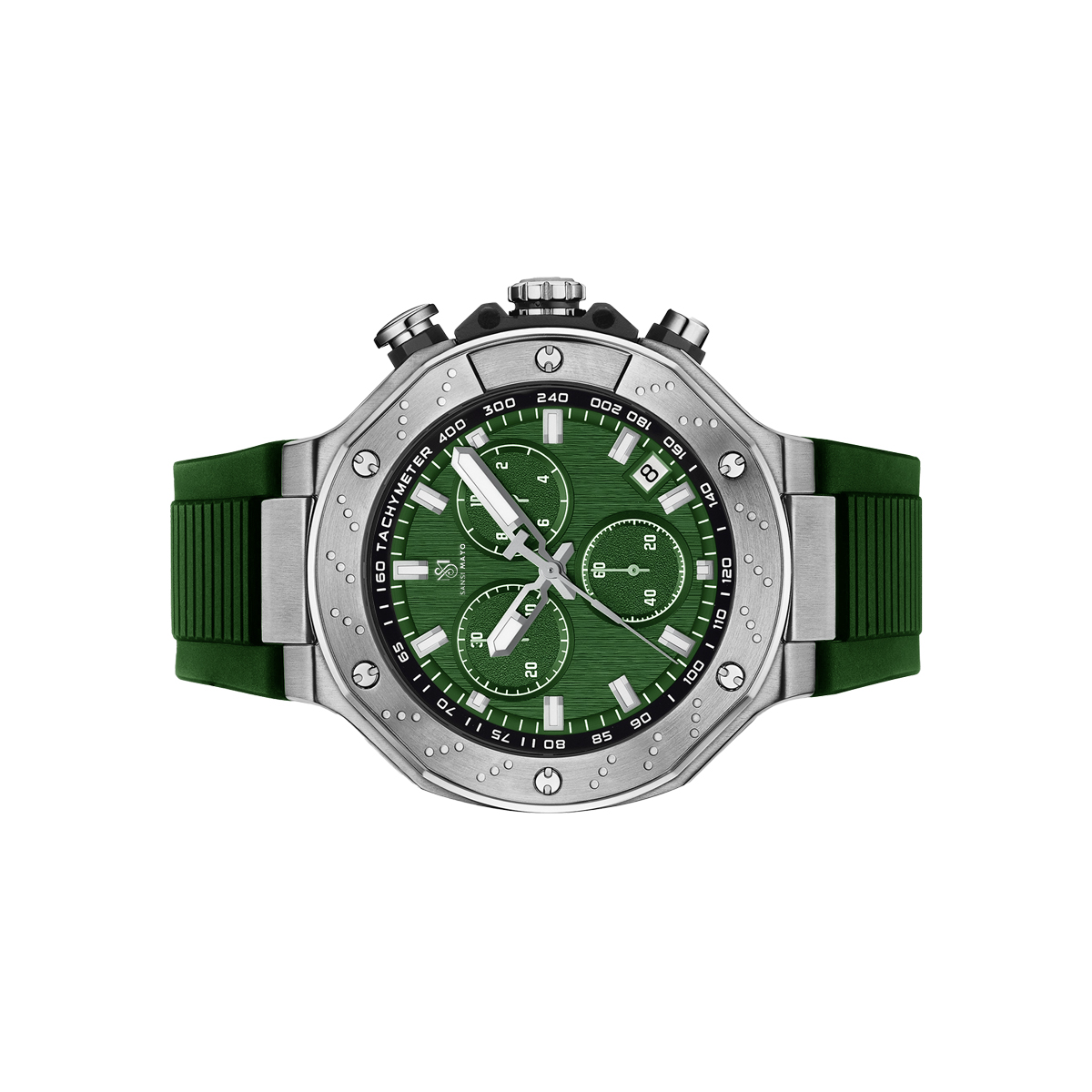 Paired with a silver stainless steel case and a matching green silicone strap, this timepiece blends durability and modern flair, perfect for those who live boldly.