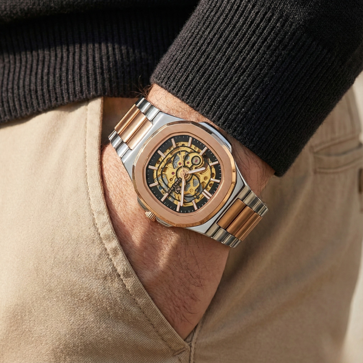 Introducing the Sansi Mayo Zeus Automatic Watch, crafted for those who command attention. Featuring a striking open-heart black gold dial, two-tone rose gold & silver bracelet, and a self-winding automatic movement — this timepiece blends precision engineering with modern elegance.